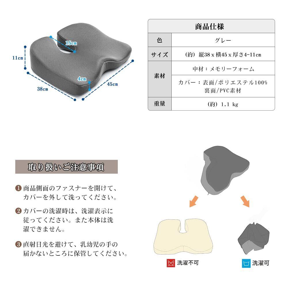 【製品仕様】サイズ:(約)縦38x横45x厚さ4-11cm 素材:中材:ポリウレタン(高品質の低反発ウレタン) カバー:表面/ポリエステル100%(通気メッシュ素材) 裏面:PVC素材 (滑り止めと粘着防止の粒子付き)。ご注意:ご購入の前に必ず商品のサイズやカラーなどの詳細をよく確認してからご注文ください。低反発クッションを初めてお使いになる場合、低反発素材の感触に慣れるまで1-2週間かかることがあります。