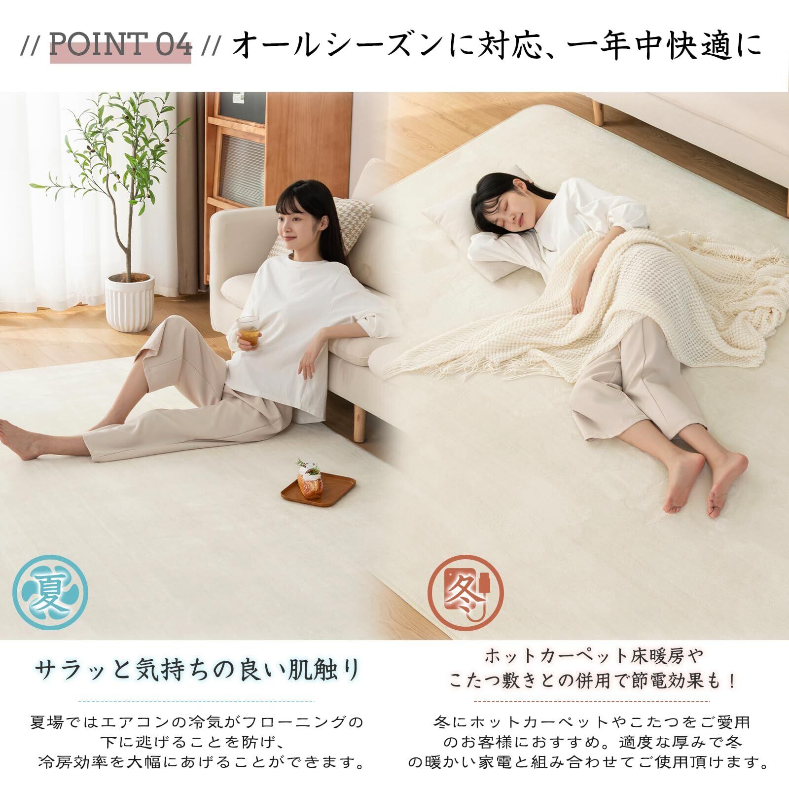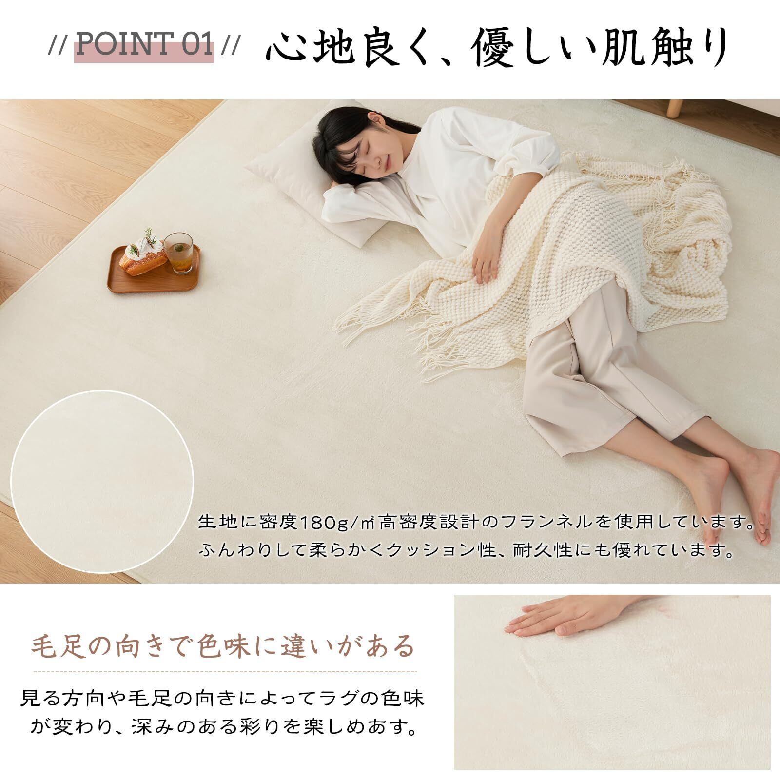 【フランネル素材・オールシーズン対応】 きめが細かく柔らかいマイクロファイバーを高密度で織り込みました。ふんわりと心地いい肌ざわりが特徴です。オールシーズン使えるフランネル素材絨毯が、光の加減や毛並みで色合いが変化します。