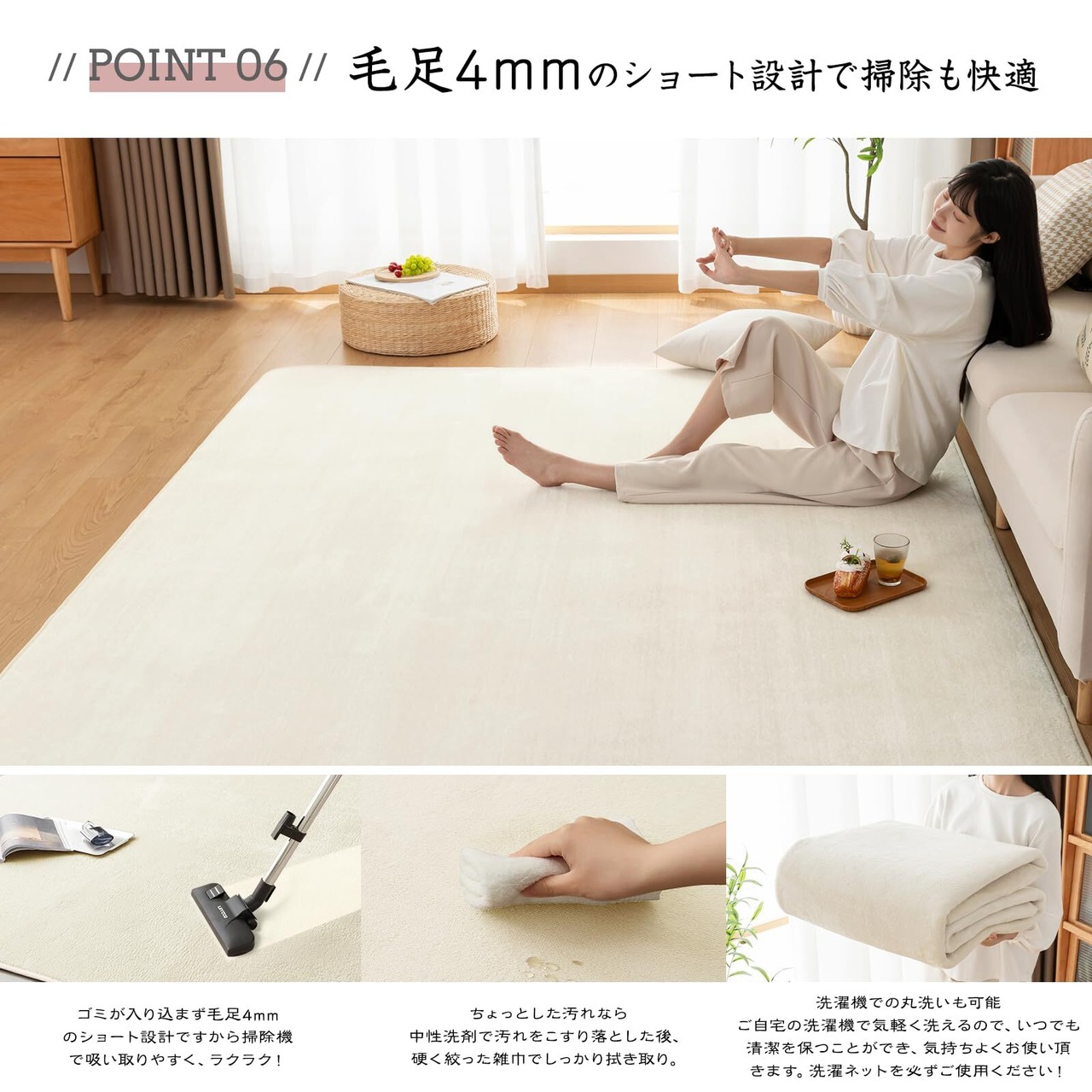 【軽量設計・お手入れ簡単】適度な毛足の長さで、ゴミやほこりが絡まりにくい、掃除機で掃除することもできます。使っていると気になる汚れも、ご家庭で丸洗いができるから安心です。軽量だからお洗濯や模様替えの際の持ち運びもラクラク。※洗濯機洗いする前にお使いの洗濯機の指定容量等をご確認の上、洗濯してください。洗濯機に入らない場合は無理に押し込まず、手洗いしてください。