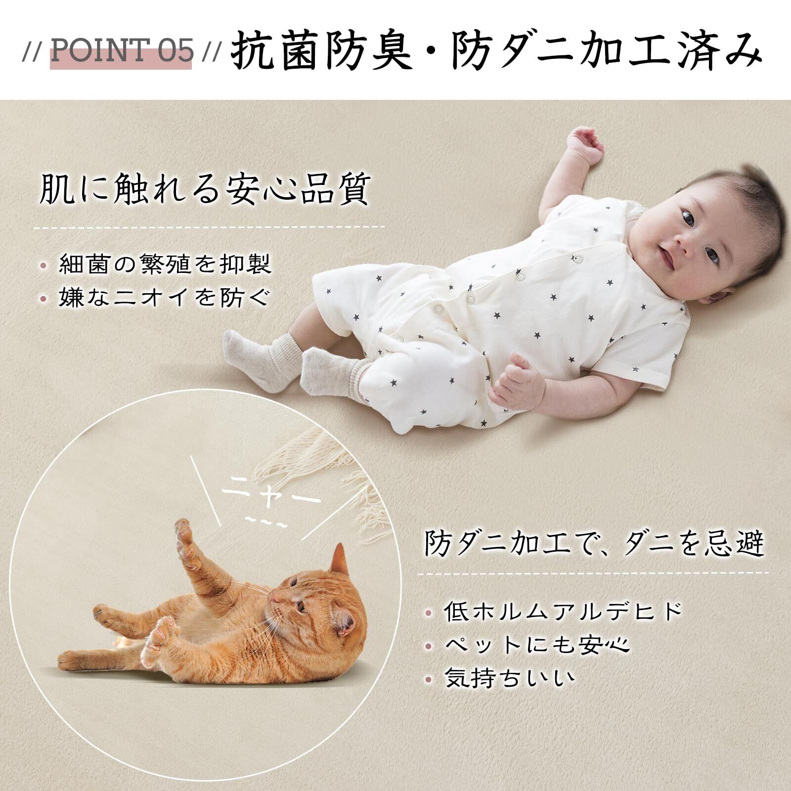 【抗菌防臭・安全安心】肌が直接触れるラグだからこそ、安心してお使いいただけるように菌の繁殖や、臭いを抑制する抗菌·防臭加工とダニの繁殖を抑制する効果のある防ダニ加工を施しています。当社の製品は薬剤等を使用して様々な加工を施しておりますが、身体に害になるような過剰な加工は、一切しておりません。低ホルマリン基準をクリアした当社の製品はアレルギーが気になる方やお子さまがいる家庭でも安心してお使いいただけます。