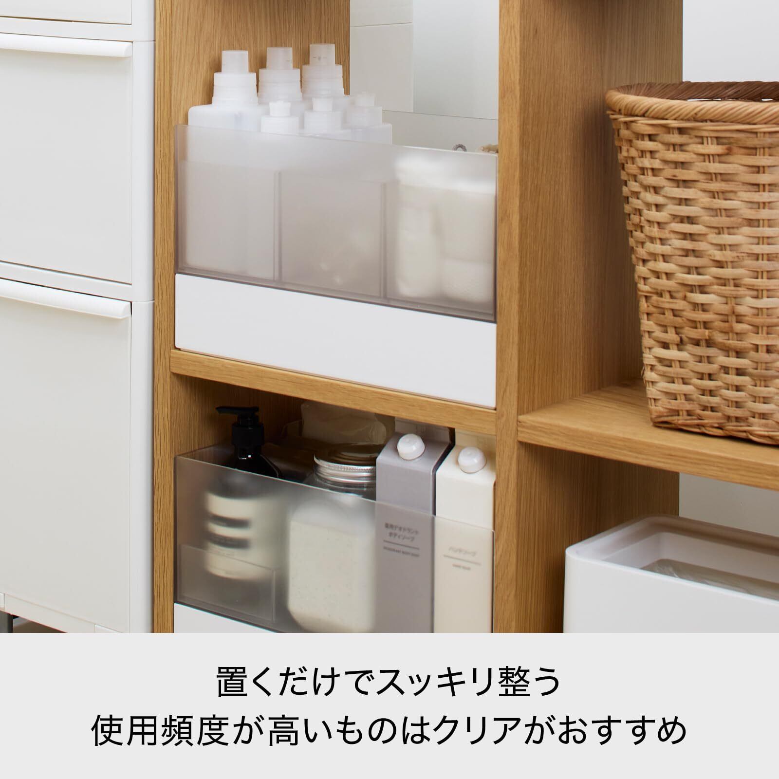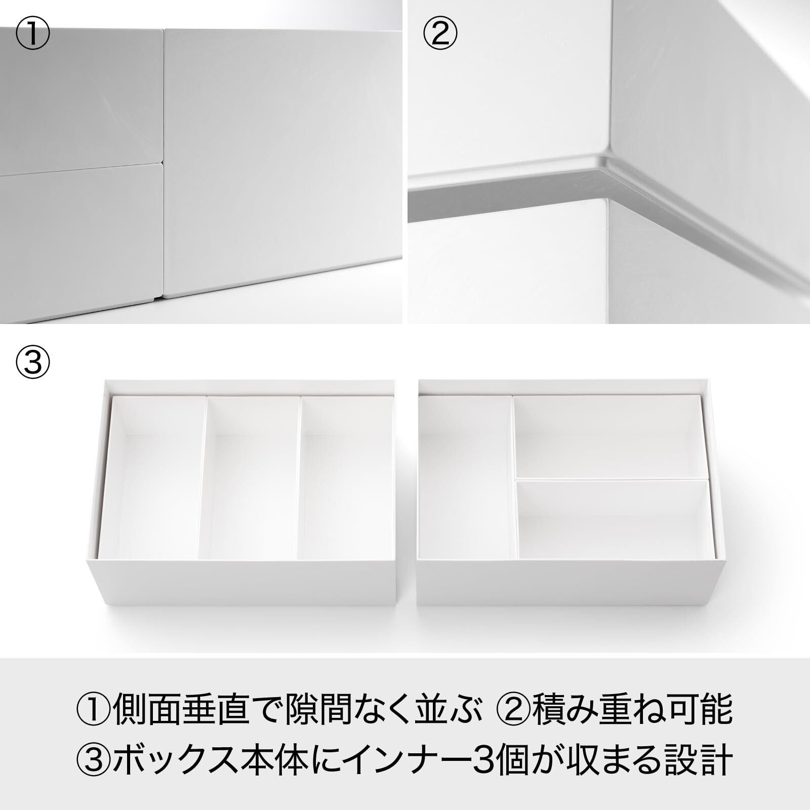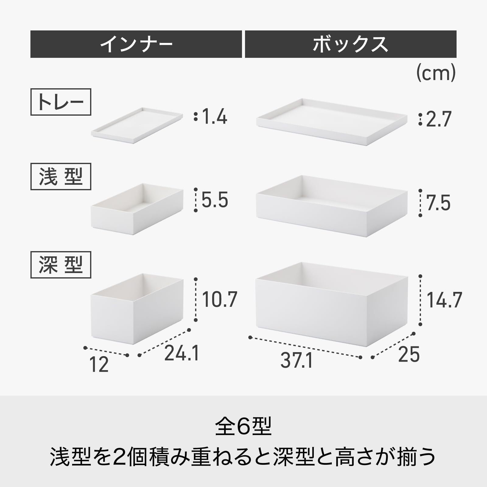 ■環境にも配慮した見せる収納:オープンシェルフ、キッチンパントリー、エントランスクロークなど扉がない収納棚が多く、そのような場所での“見せる収納”として余計な機能を削ぎ落としたシンプルで汎用性が高い収納用品です。 ■組み合わせて使える6型:ボックス(深型・浅型・トレー)、インナー(深型・浅型・トレー)の6型展開。ボックス外寸が約25×37cmで、奥行きの浅い棚(D25cm)には横向きに、深い棚(D40cm)は縦向きに置くこと ができます。インナーはボックスと組み合わせて使うことはもちろん、ガジェット整理、茶菓子入れ、お出掛けグッズ収納など単体使いも便利です。