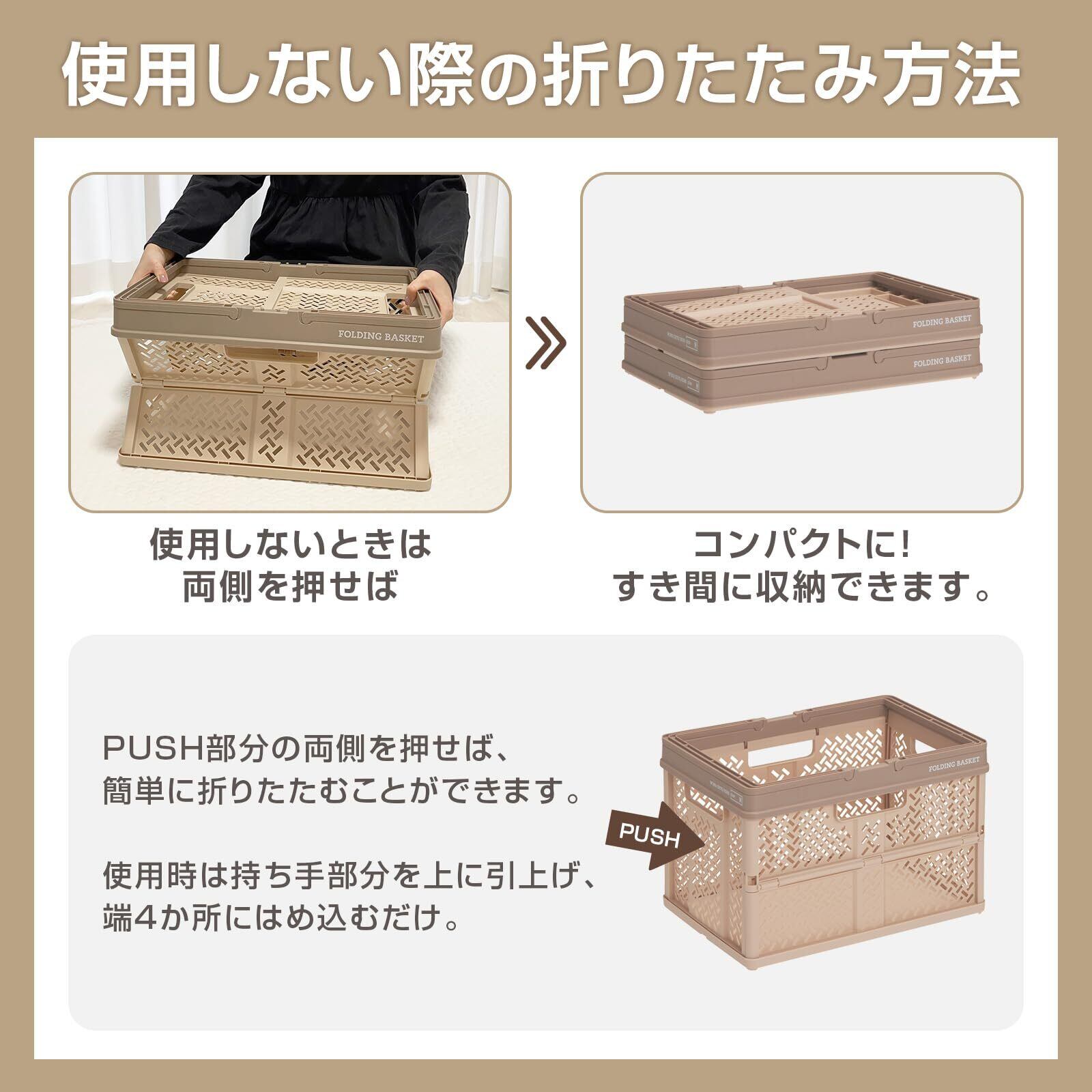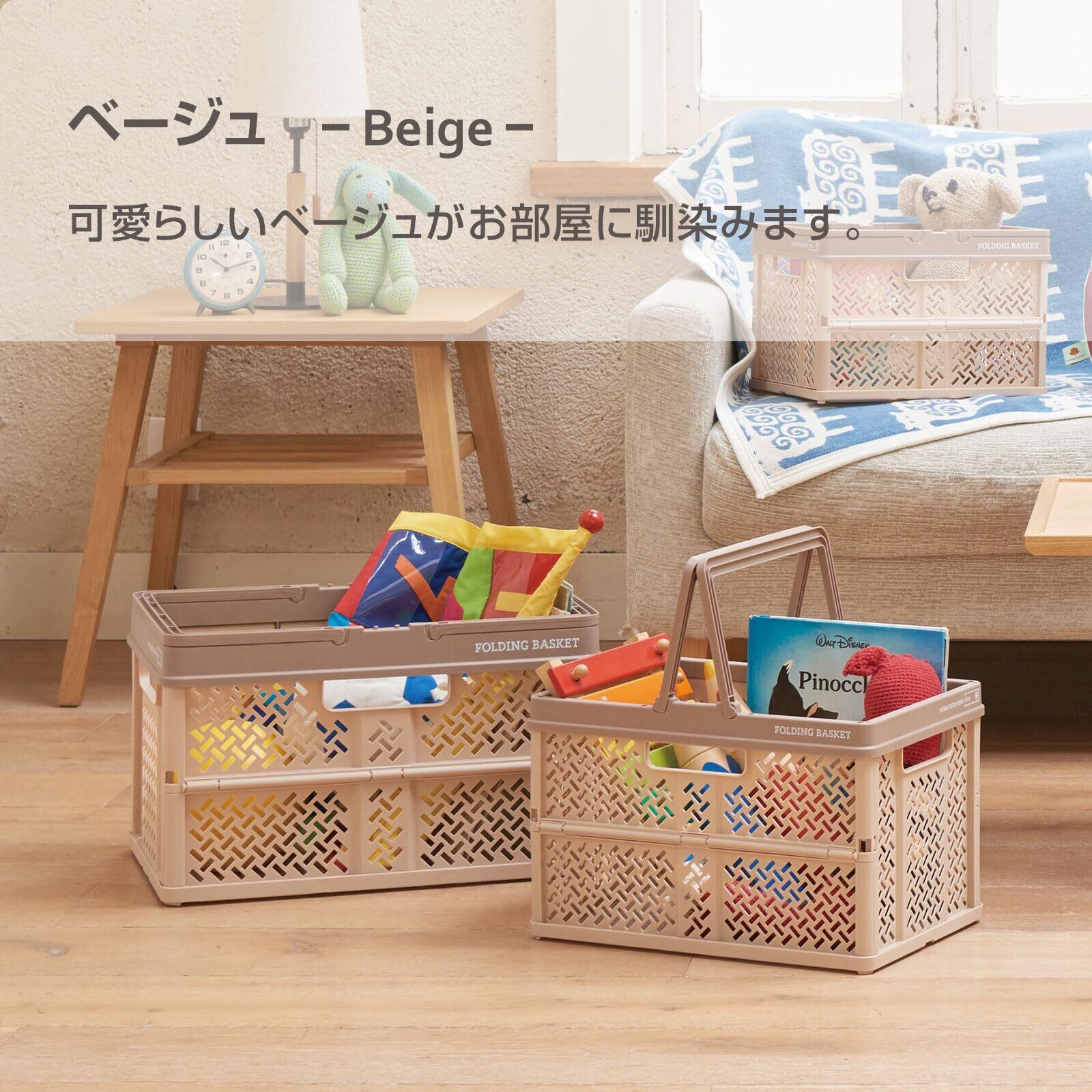 おしゃれなデザインのハンドル付きバスケットです。折りたためるので、使用しないときはコンパクトに畳むことができます。おもちゃや衣類、食料品の収納やレジャー時の荷物入れなど幅広くお使いいただけます。