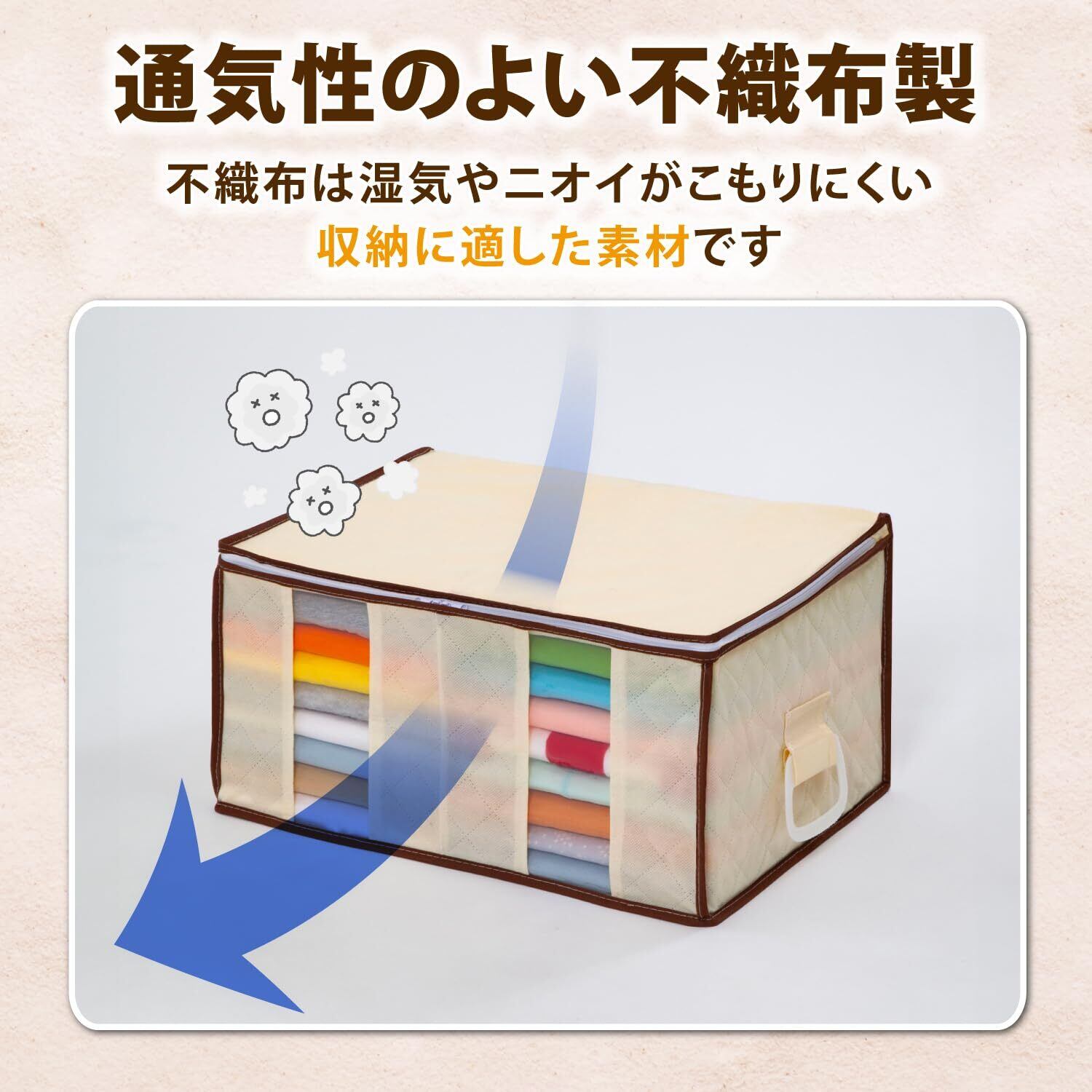 通気性が良くホコリを通しにくい生地のため、衣類や寝具の収納に適しています。