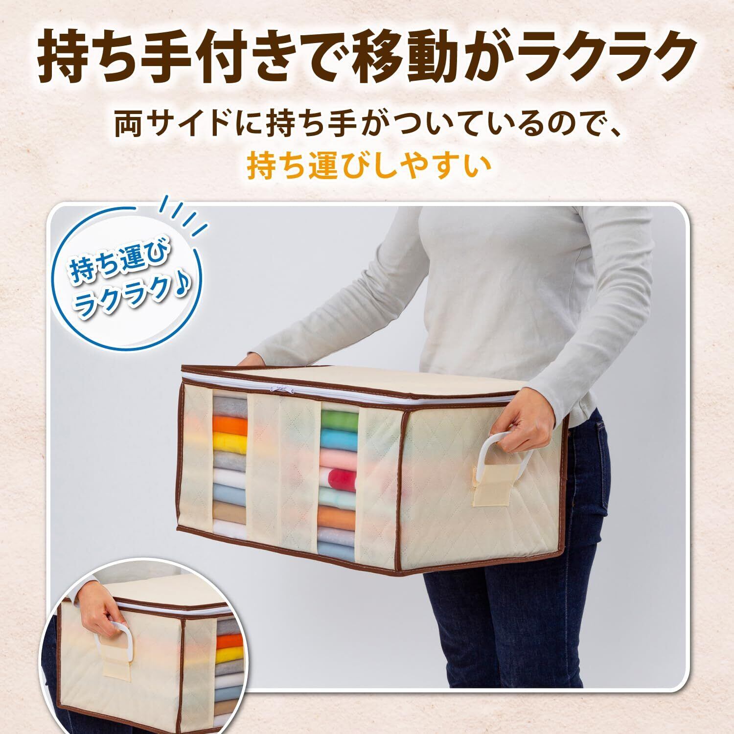 【ハンドルで持ち運び簡単】:両サイドの持ち手で、クローゼットや押入れからの出し入れ、移動もラクラク。
