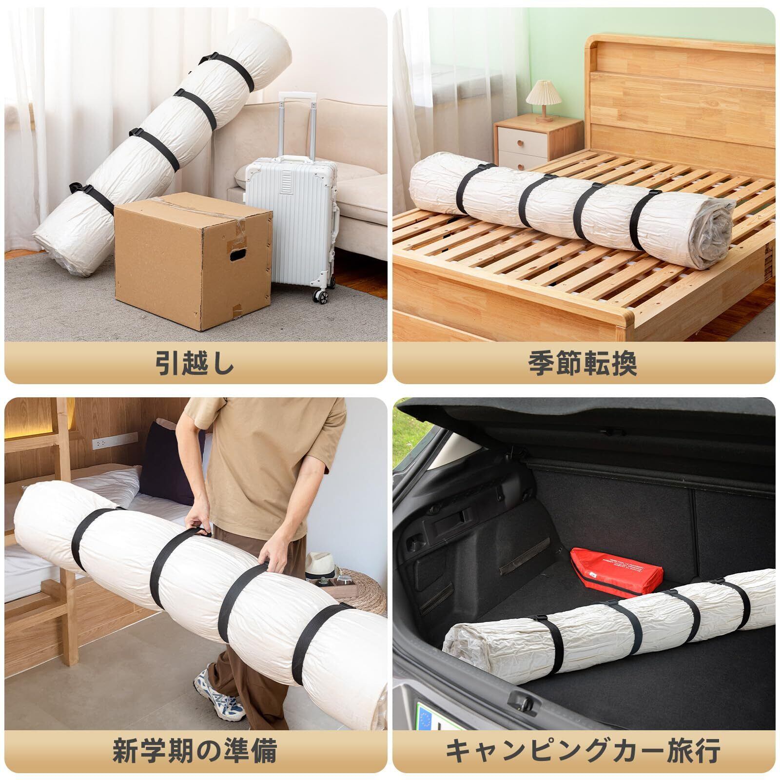 様々な場所に活躍:日常生活の様々なシーンで活躍します。季節転換の時は厚い布団やマットレスを収納でき、引っ越しや大学の入学時、さらにキャンピングカー旅の時、マットレスなどを運ぶのがより簡単になります。キャンプの時には、ピクニックシートも持っていけます