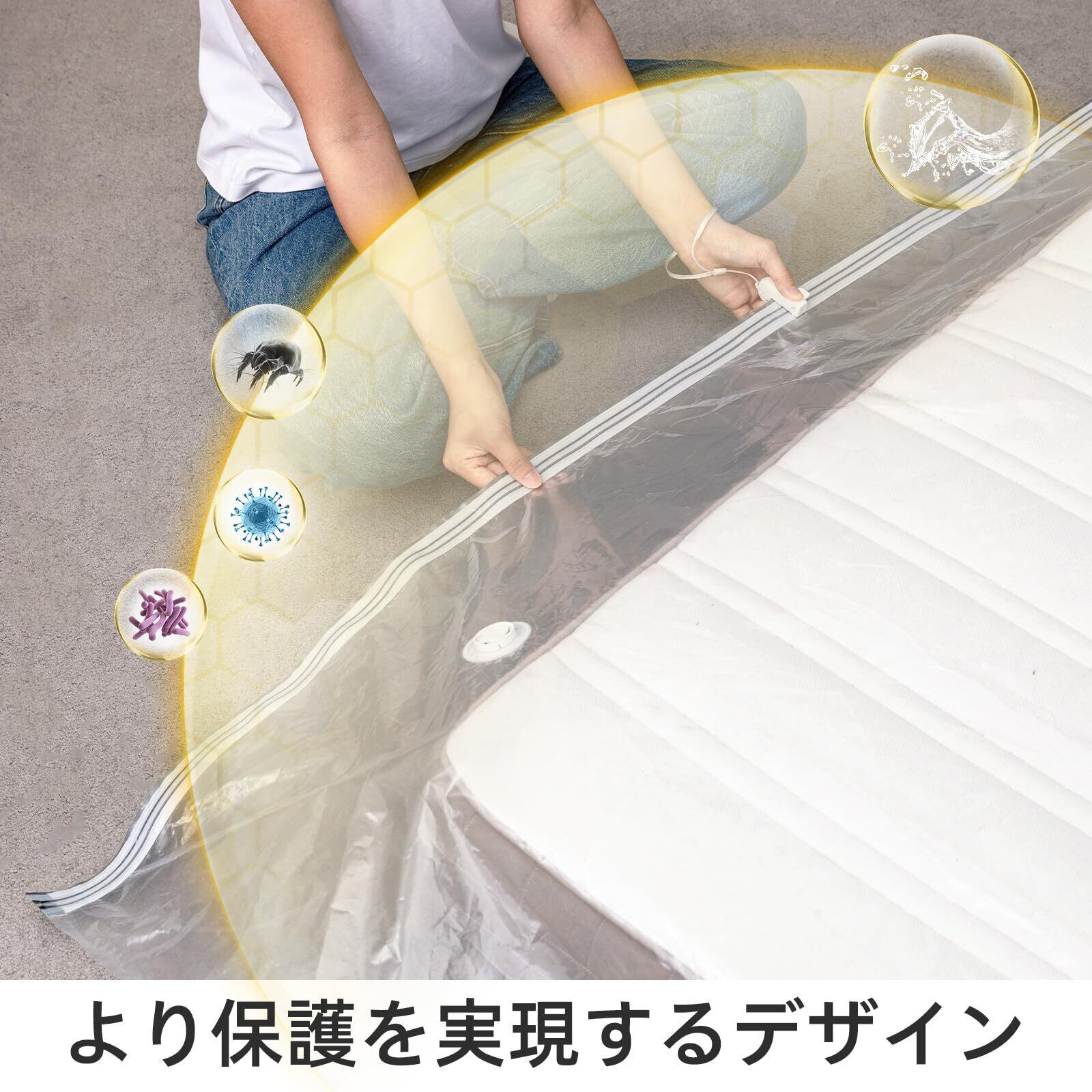抜群なデザイン:高品質な素材を採用して耐撕裂性に優れた収納袋です。高い耐摩耗性を備えており、長期間の保管に最適です。環境にやさしい、繰り返し利用が可能です。透明なバッグでマットレスを簡単に見つけて識別できます。防水防虫カビ防止防塵効果を備え、圧縮後は家の隅にスッキリ収納可能で生活空間を節約します