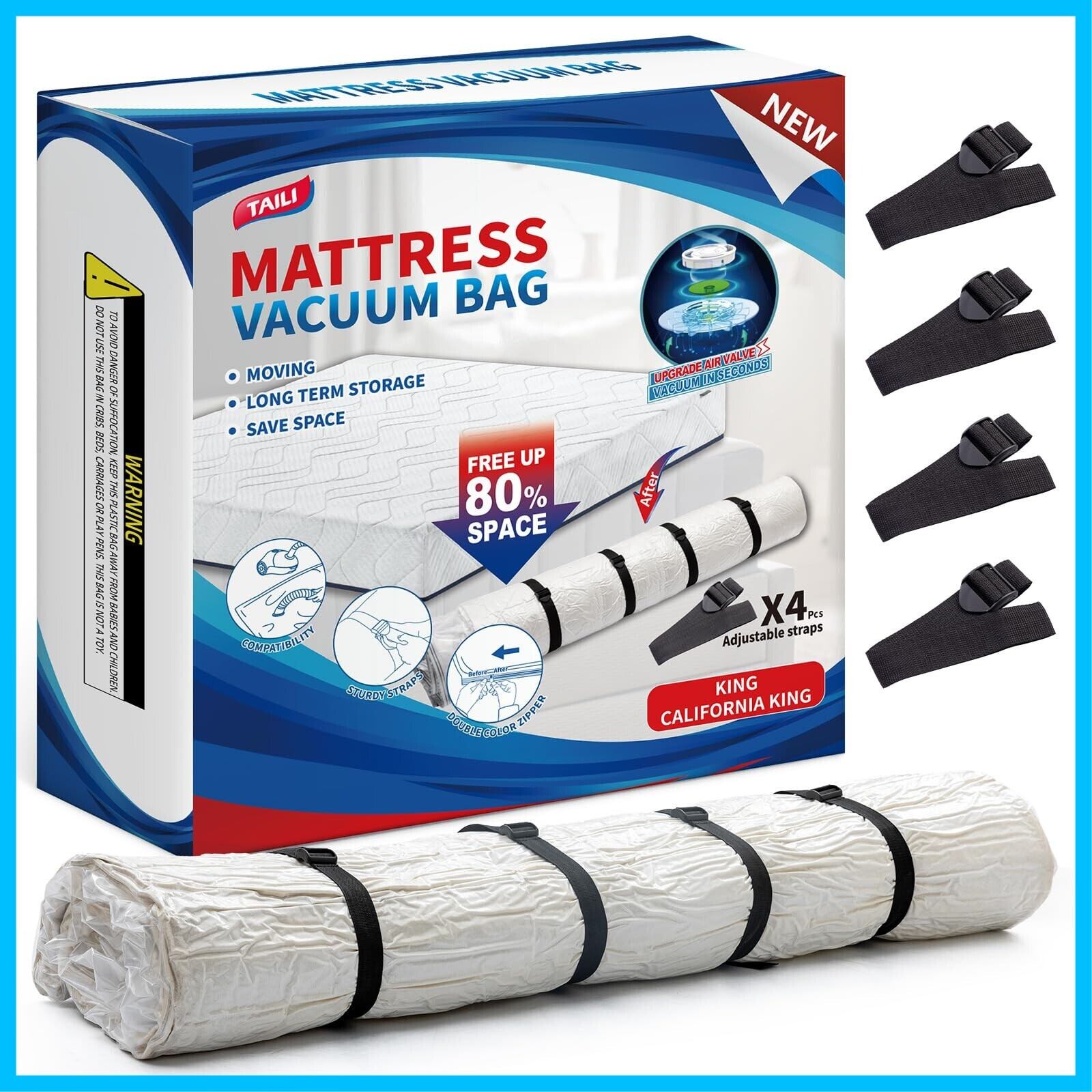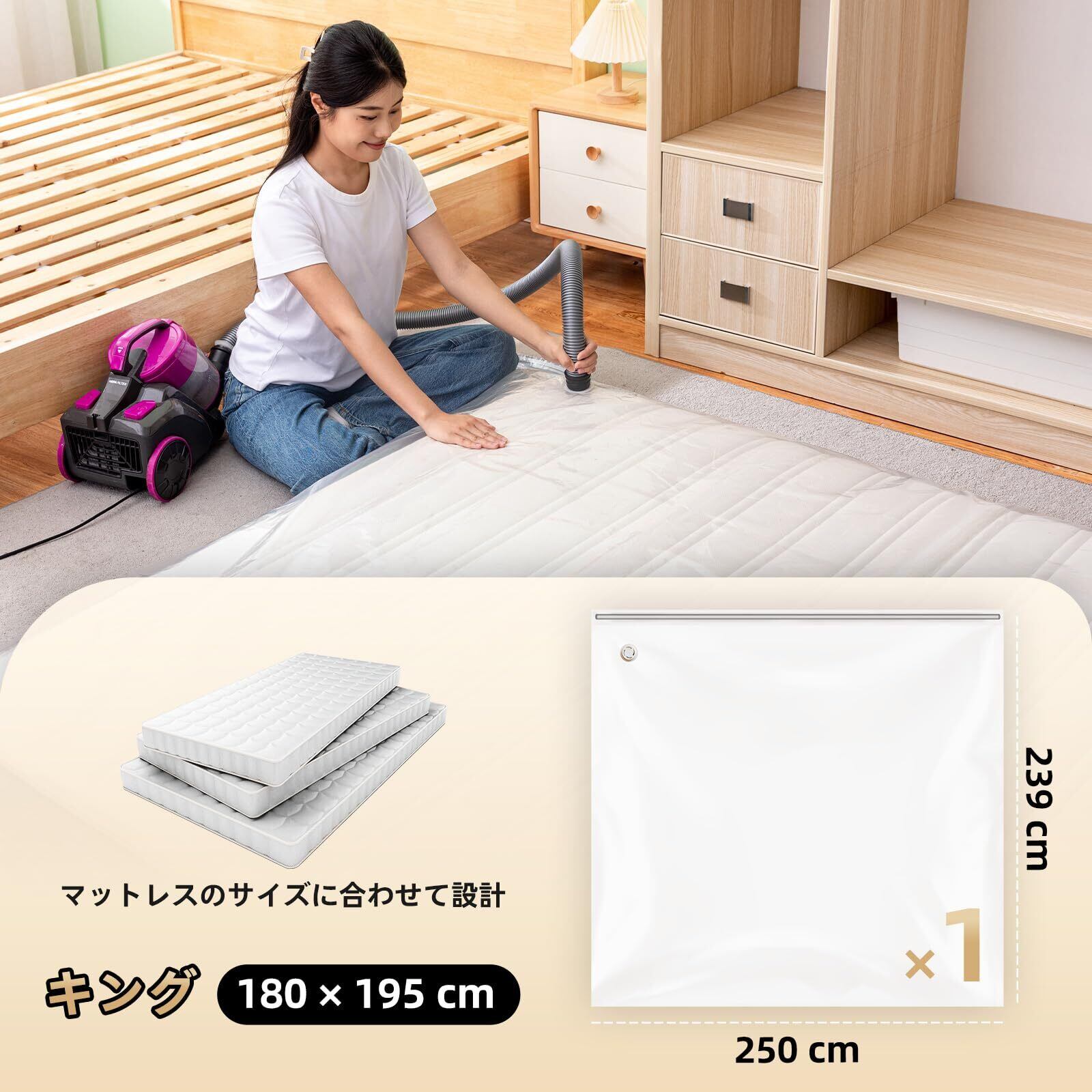 マットレスの持ち運びが簡単:マットレスの輸送と保管には、マットレス圧縮袋が欠かせません。大型のマットレス圧縮袋は250 CM × 239 CMのサイズでキングマットレスを収納することができます 。マットレス圧縮バッグは、あらゆる種類の掃除機に適しており、圧縮後は持ち運びが簡単です。マットレスバッグ収納バッグがあれば、マットレスの輸送はもう問題になりません。ご注意:スプリングマットレスには対応しておりません