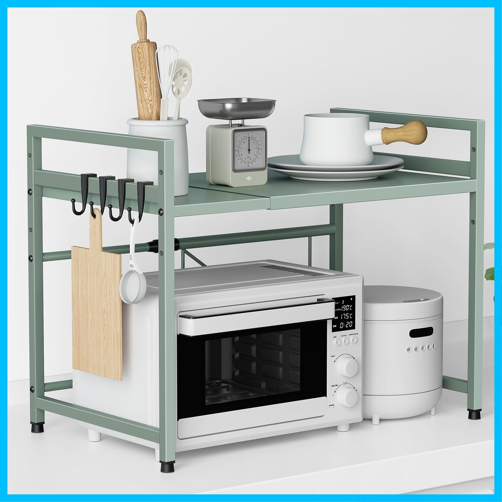 TKUIN レンジ上ラック キッチン 伸縮式 トースターラック 幅(39-65cm) 伸縮可 オーブンレンジラック 棚板高さ調節可 電子レンジ 台 収納 耐荷重50kg フック4つ付き 組み立て簡単 おしゃれ (グリーン)