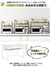 【耐荷重能力が強い】伸縮式ラックの耐荷重は約15-50Kgで、幅により異なります。最小幅39㎝の場合、耐荷重は約50Kg、最大幅65㎝の場合、約15Kgです。トースターや、ポット、コーヒーメーカーなど普通の小電気製品や鍋も棚板の上に置いて、棚板の変形や壊れ等の心配なくて安定です。安心にご使用できます。