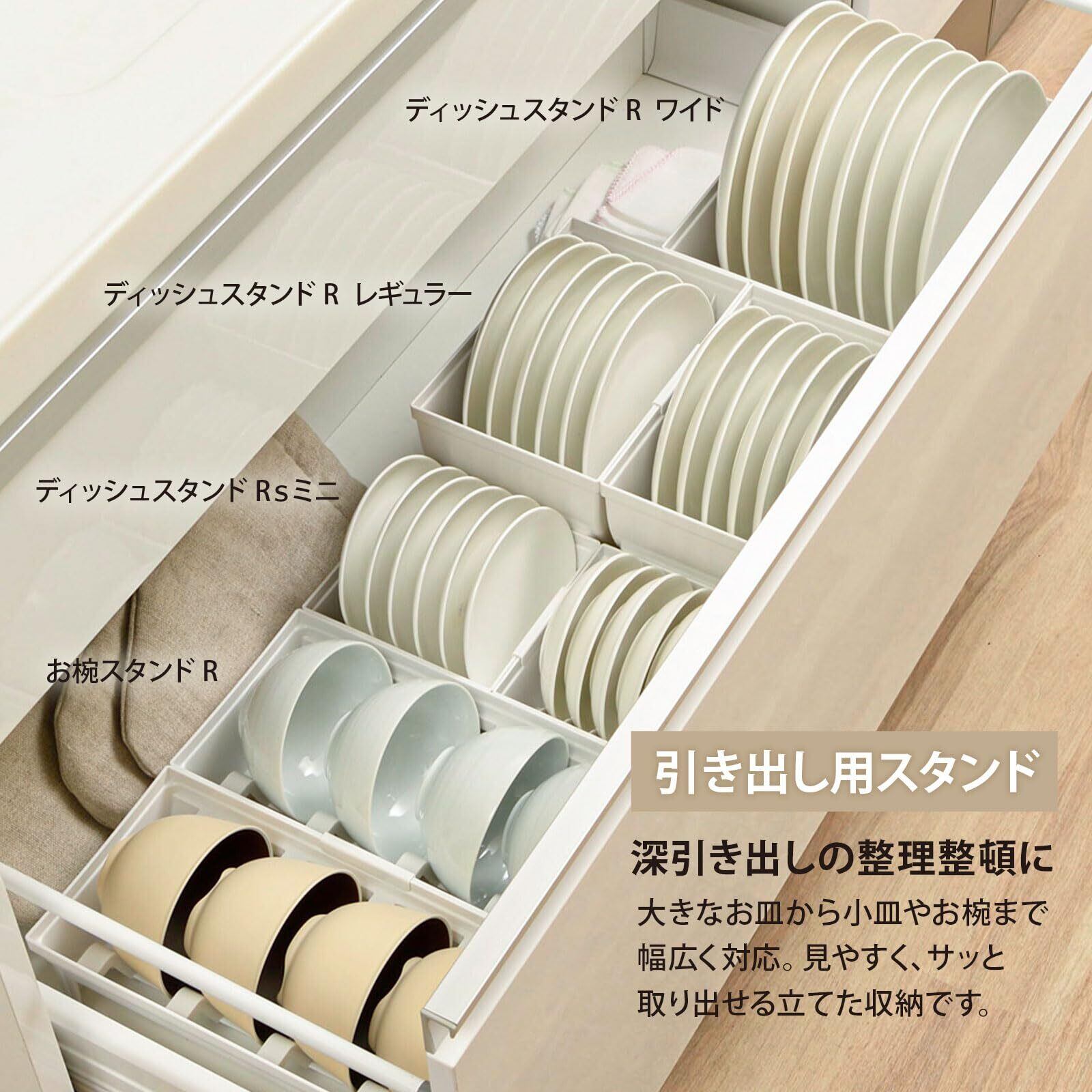 【立てて収納】お皿を深引き出しに立てて収納することで見やすく、サッと取り出すことができます。【ジョイント付き】同じ高さのお椀スタンド、キッチンツールボックスと連結できます。