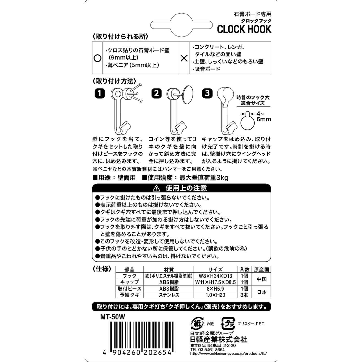 日軽産業 フック クロックフック MT-50W 奥行1.3×高さ3.4×幅0.8cm キャップ1個、取付ピース1個、予備クギ3本 0523-255