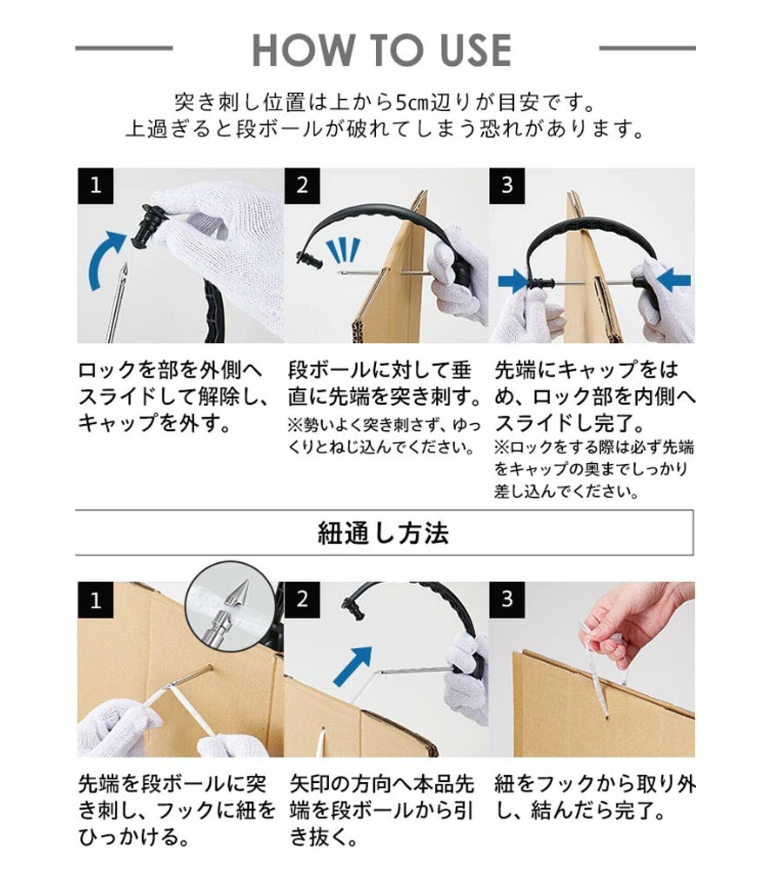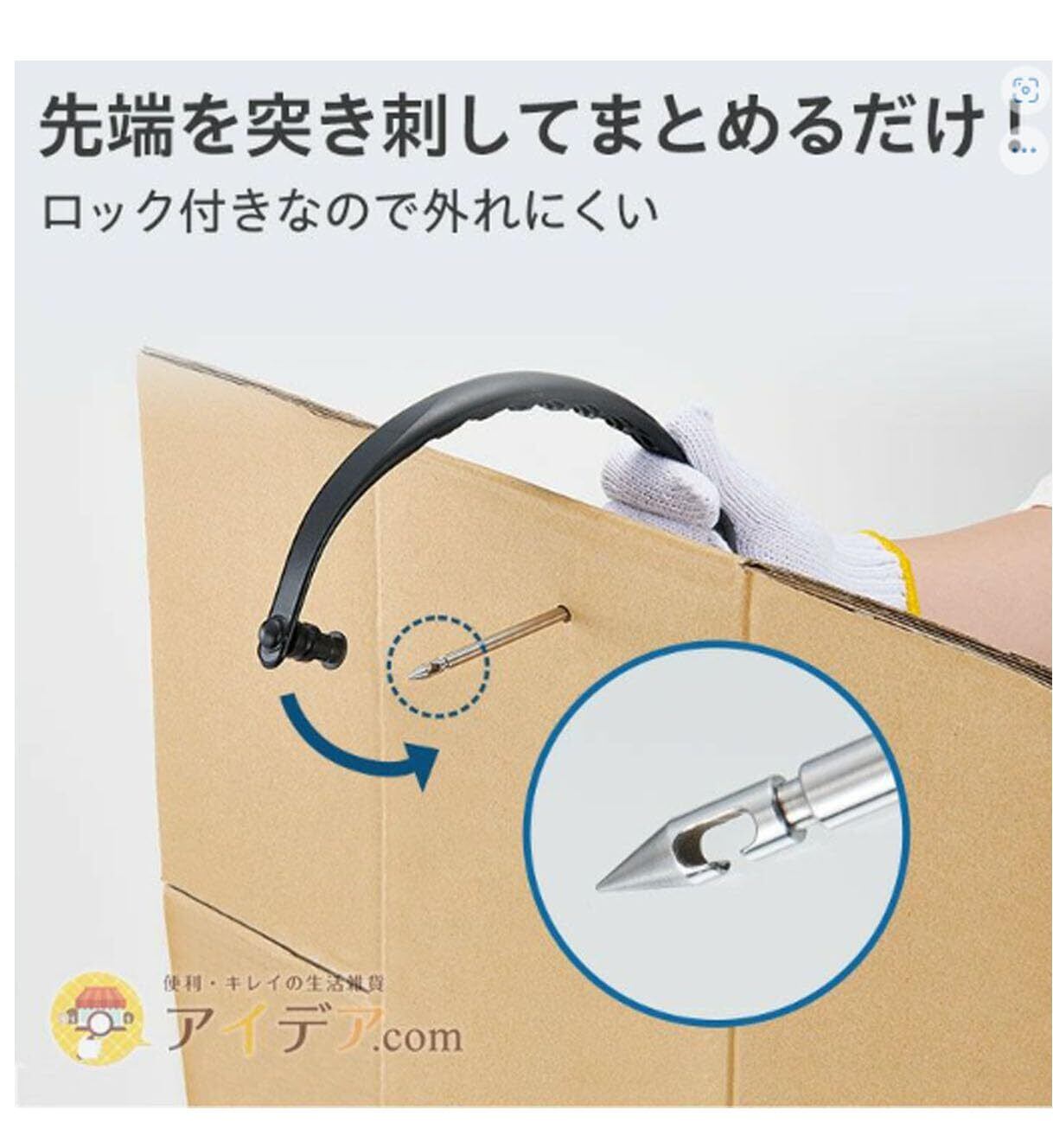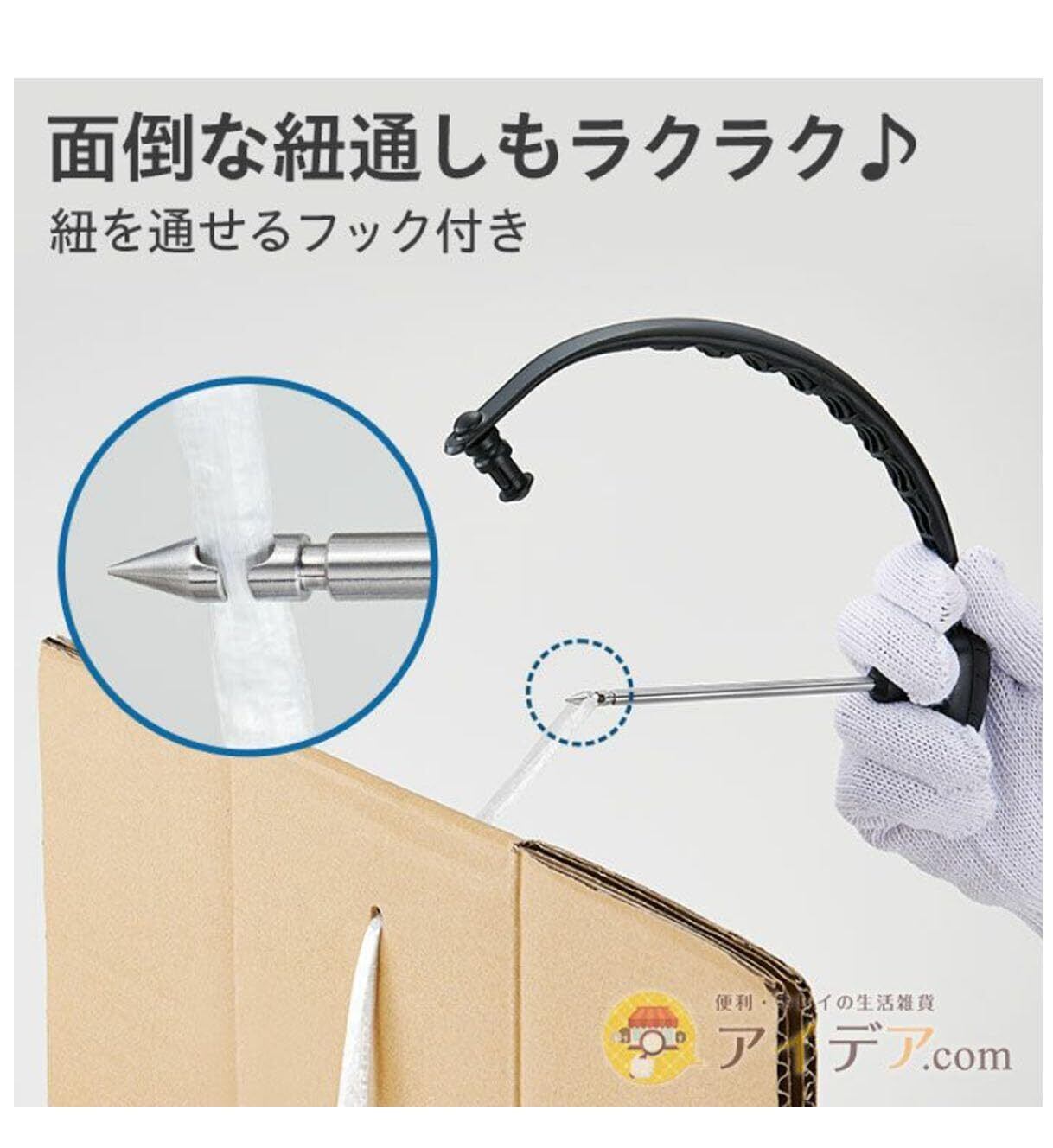 先端は紐を引っ掛ける事のできるフック型なので段ボールを紐でまとめる時も便利。
