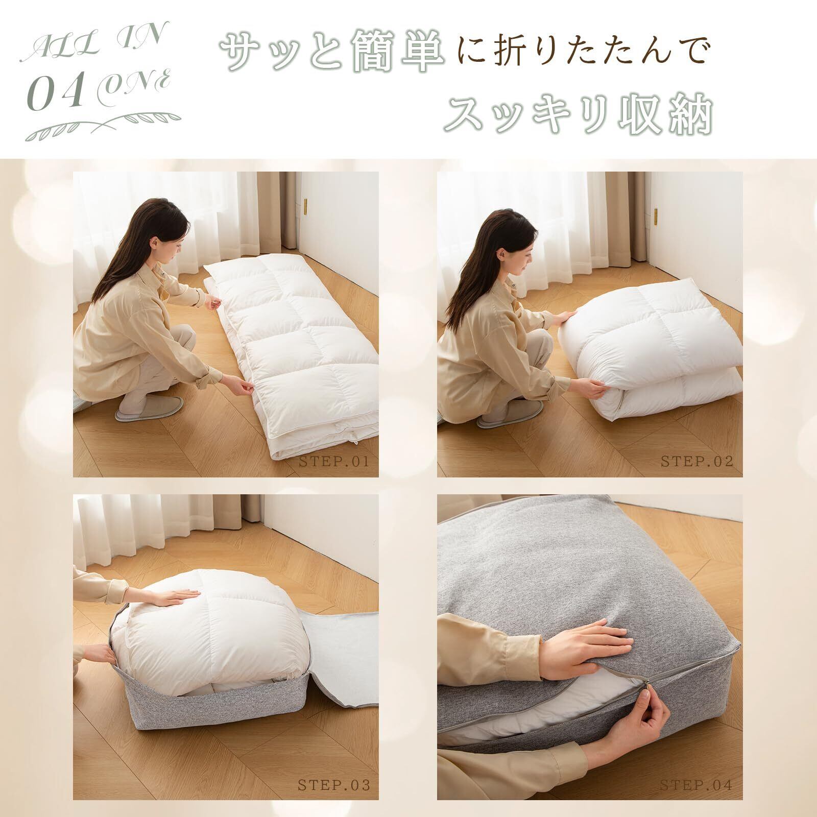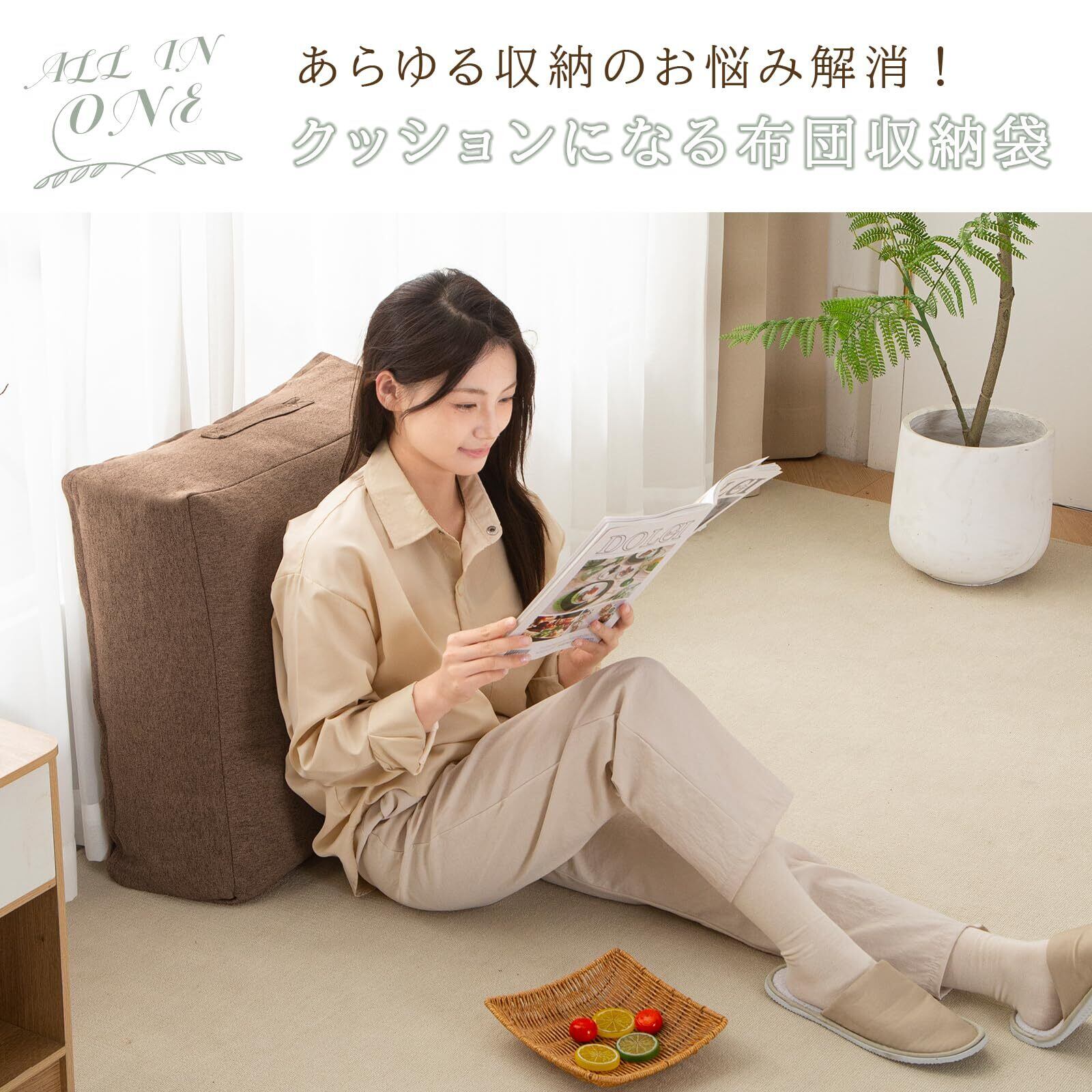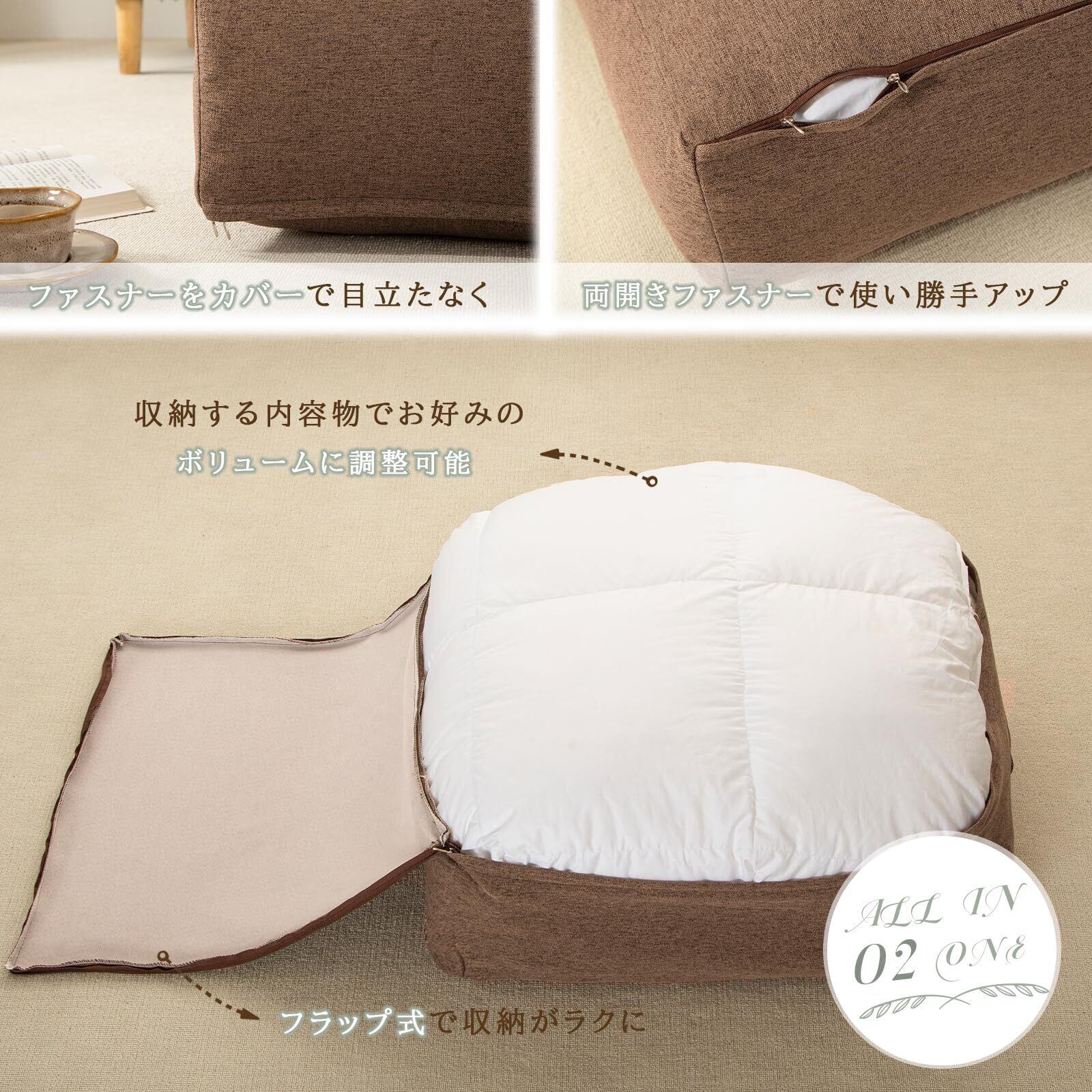 「クッションになる布団収納ケース」収納とインテリアを両立する快適な空間づくりを実現。ナチュラルな色合いの高品質な生地で、来客時にも生活感なく空間に溶け込みます。布団収納だけでなく、インテリアとしても優れたデザインです。