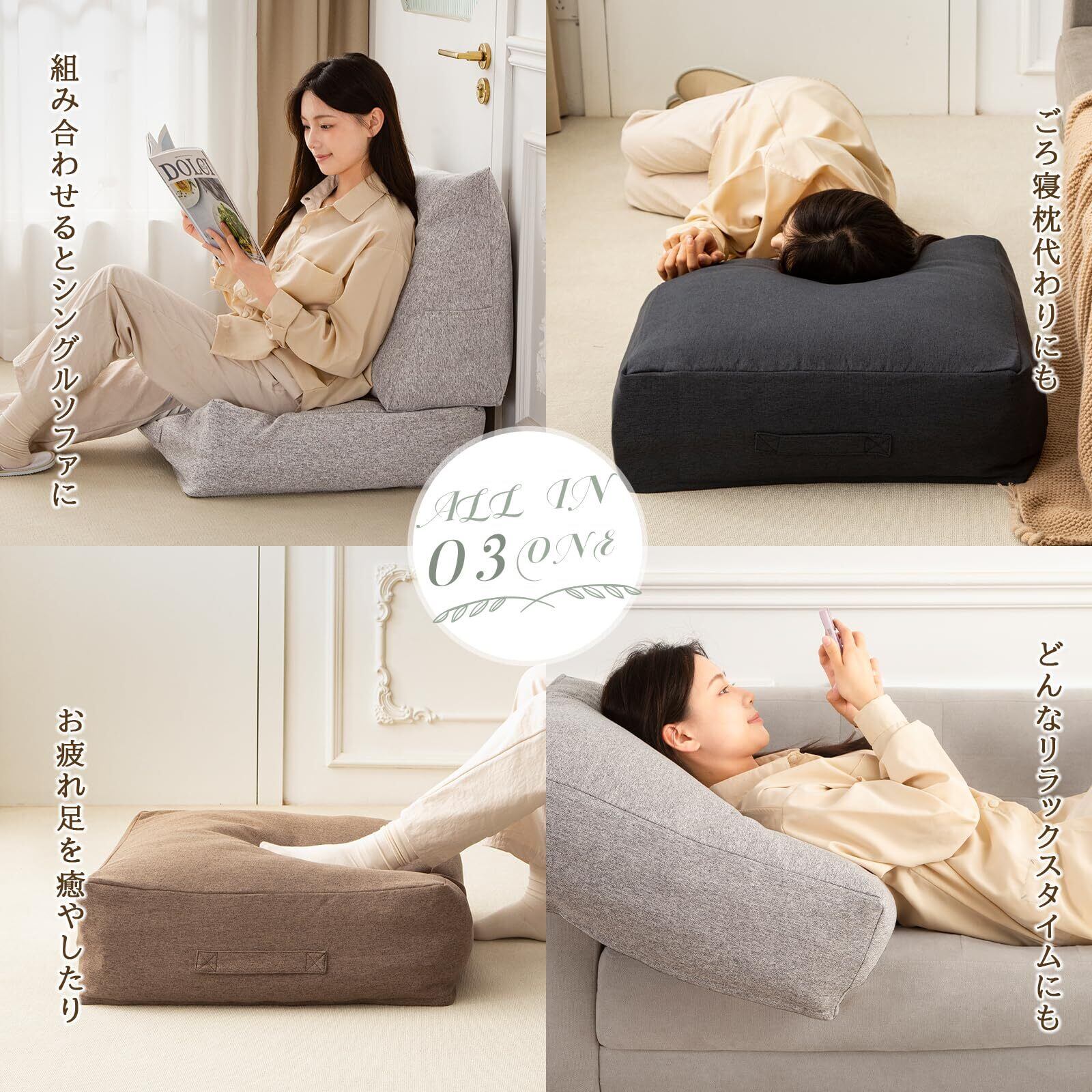 「様々なシーンで活躍」背もたれ: 読書や映画鑑賞時に、肘置きや背もたれとして使えます。足置き: 足を置いたり、リラックスした姿勢でくつろげます。抱き枕: テレビを見ながらゴロゴロしたり、お昼寝時のリラックスタイムにぴったりです。