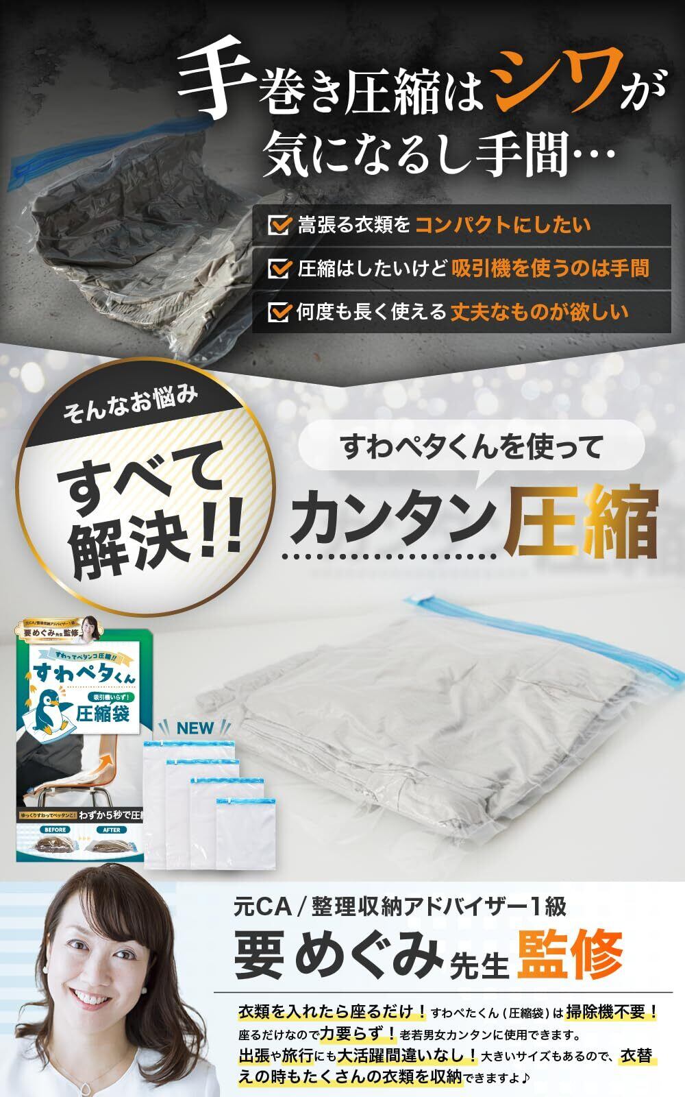 【 超カンタン手間入らず 】 従来の圧縮袋のようにポンプや掃除機、手で巻く面倒な作業は不要。座って押しつぶすだけで圧縮できるので、誰でもカンタンに圧縮ができます。旅行や出張はもちろん、収納整理にも最適。