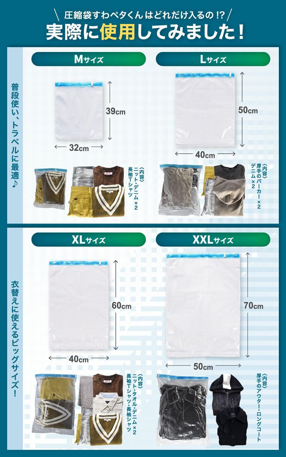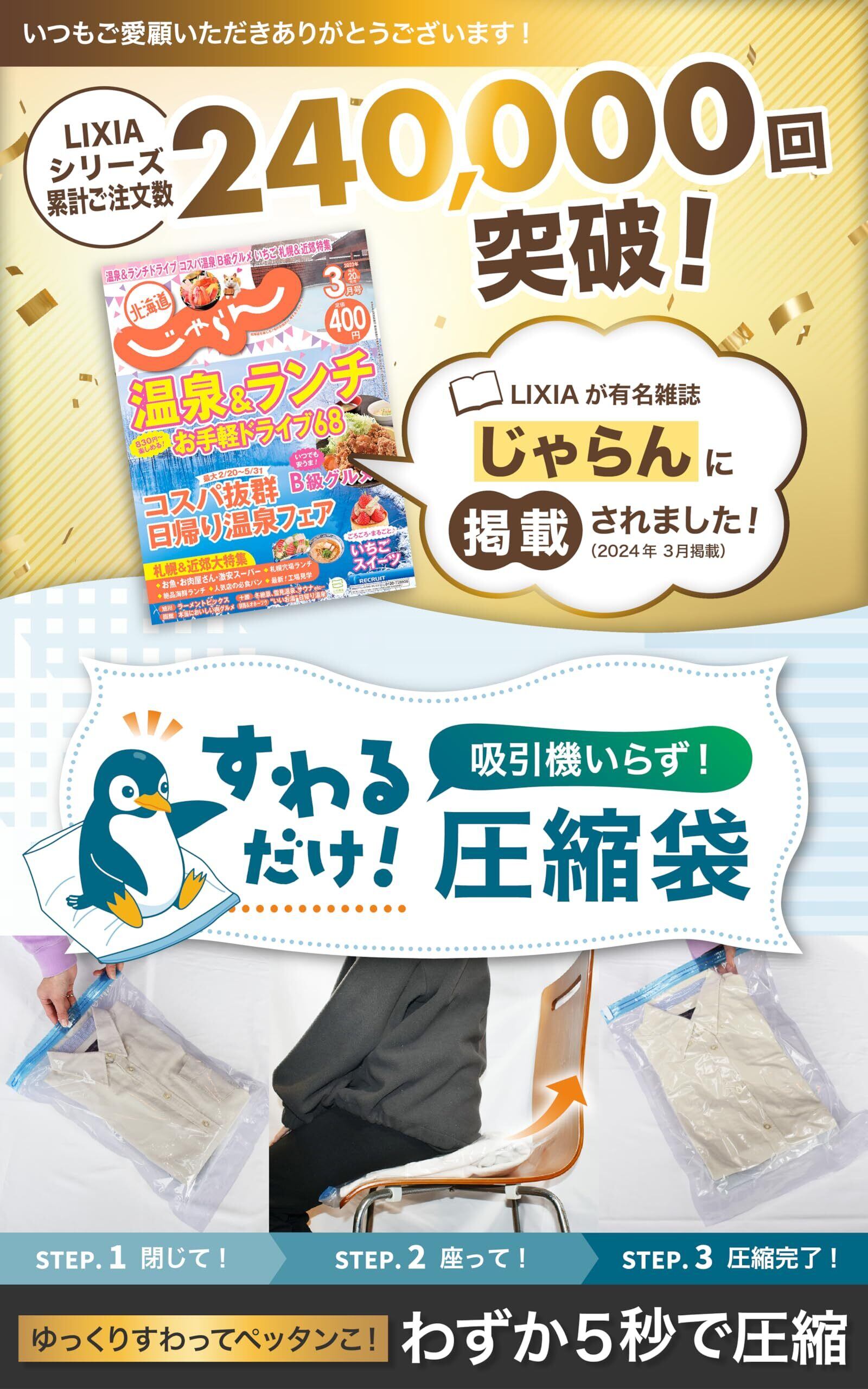 【 上から座るだけ。わずか5秒で圧縮 】 LIXIAのすわペタくんは独自開発の構造により嵩張る衣類をわずか5秒ほどで力を使わず、上から座るだけで荷物の量が約1/2〜1/4ほどのサイズに変身!是非LIXIAの圧縮袋で荷物に囚われない旅行をお楽しみください!