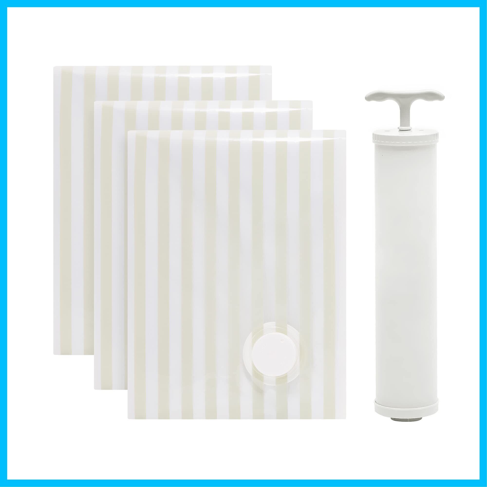 ベーシック 布団圧縮袋 掃除機不要 ハンドポンプ付き 収納 カビ対策 3枚組 ファスナー 130×100cm ダブルカラー (表:透明とベージュのストライプ/裏:白)