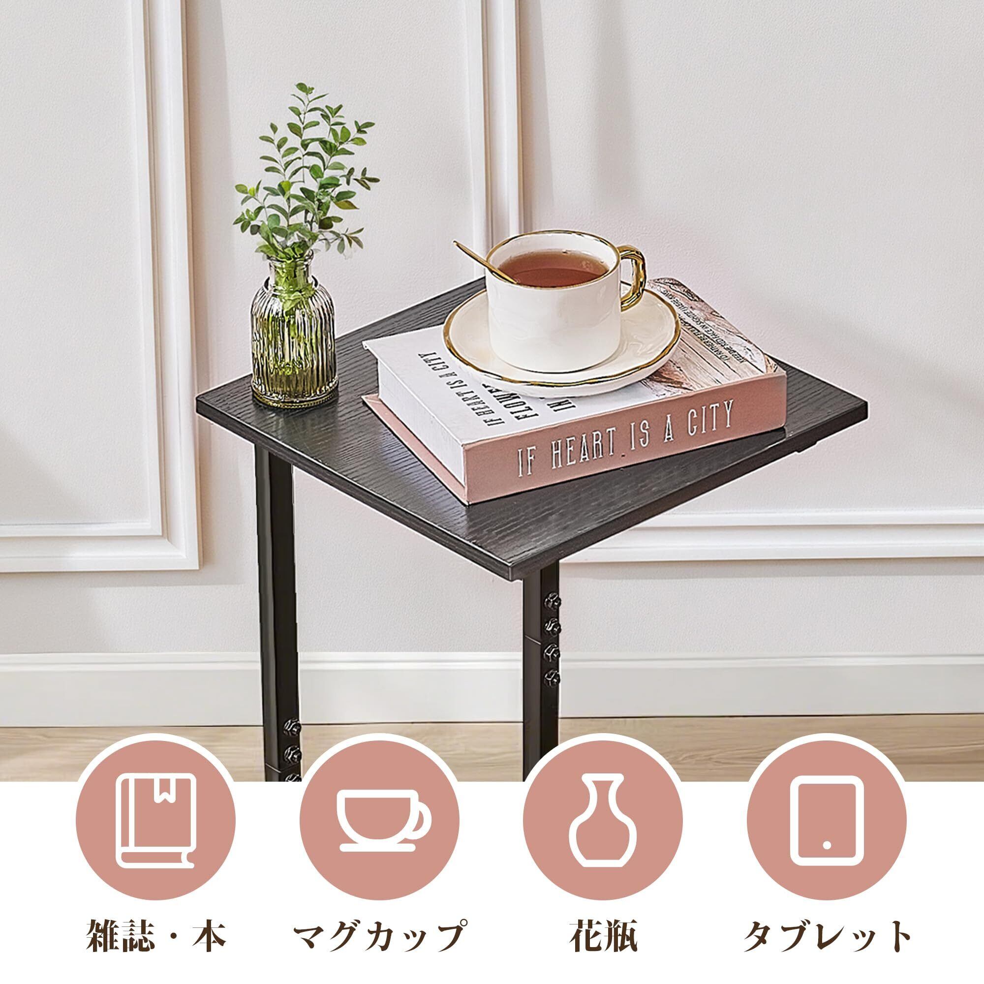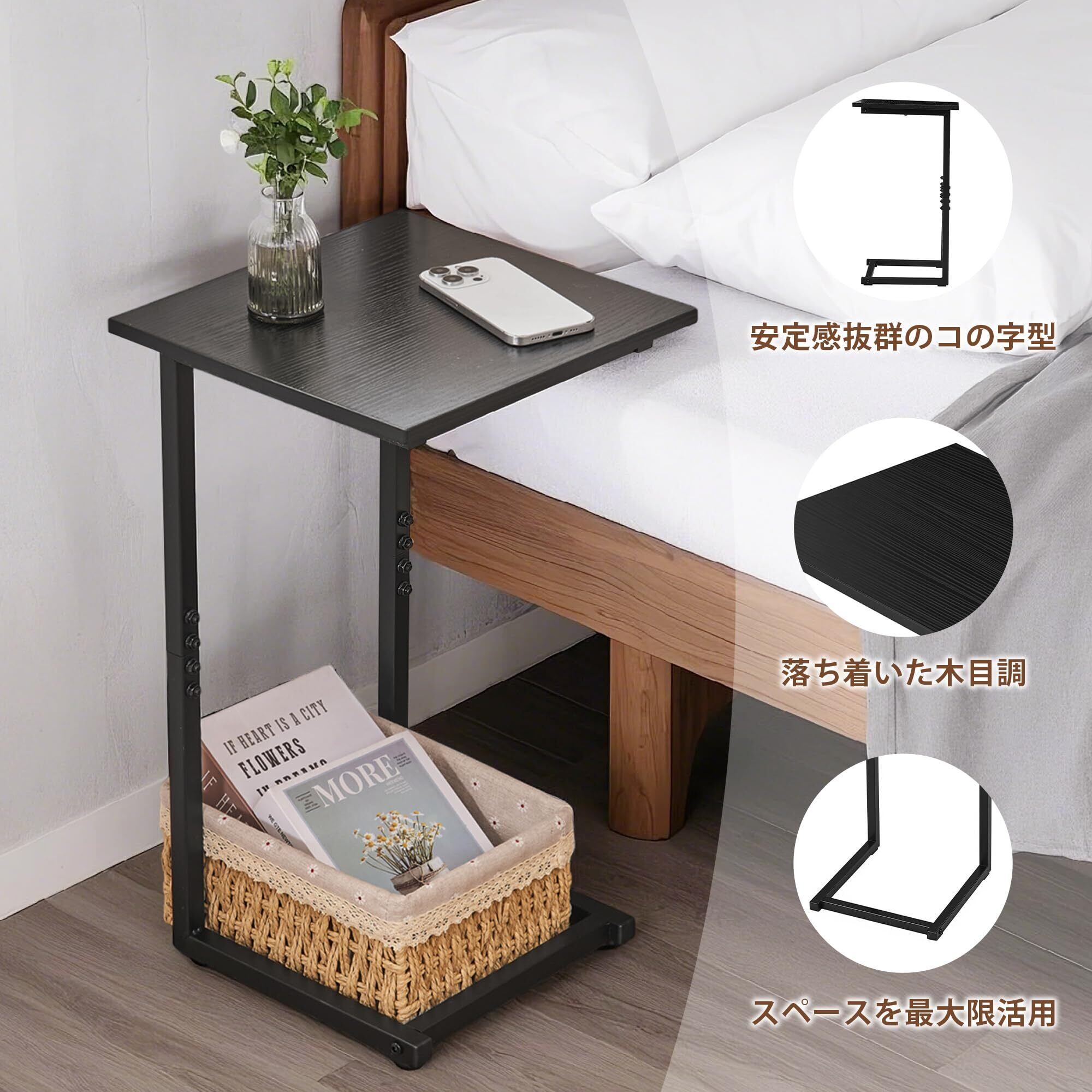 【シンプルでおしゃれなデザイン】落ち着いた木目調の天板とシックな黒色フレームの組み合わせは、どんなインテリアスタイルにもマッチします。モダン、ミニマル、北欧風など、どんな空間にも自然に馴染むデザインで、実用性と美観を兼ね備えた理想的なサイドテーブルです。