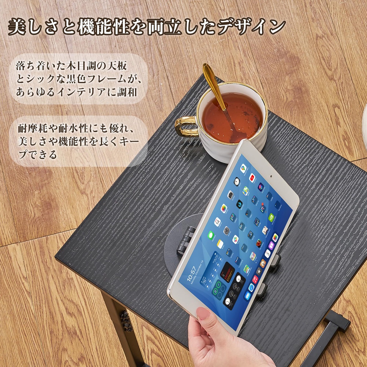 【安定した構造】頑丈で安定感のある構造により、使用中にぐらつく心配がありません。ラップトップ、コーヒーマグ、観葉植物などを安心して置くことができます。また、丈夫で耐久性の高い素材を使用しているため、優れた耐荷重性能を発揮し、重い物を置いても安心して使用できます。さらに、耐摩耗性や耐水性にも優れており、長期間にわたり美しさと機能性を保ち続けることが可能です。