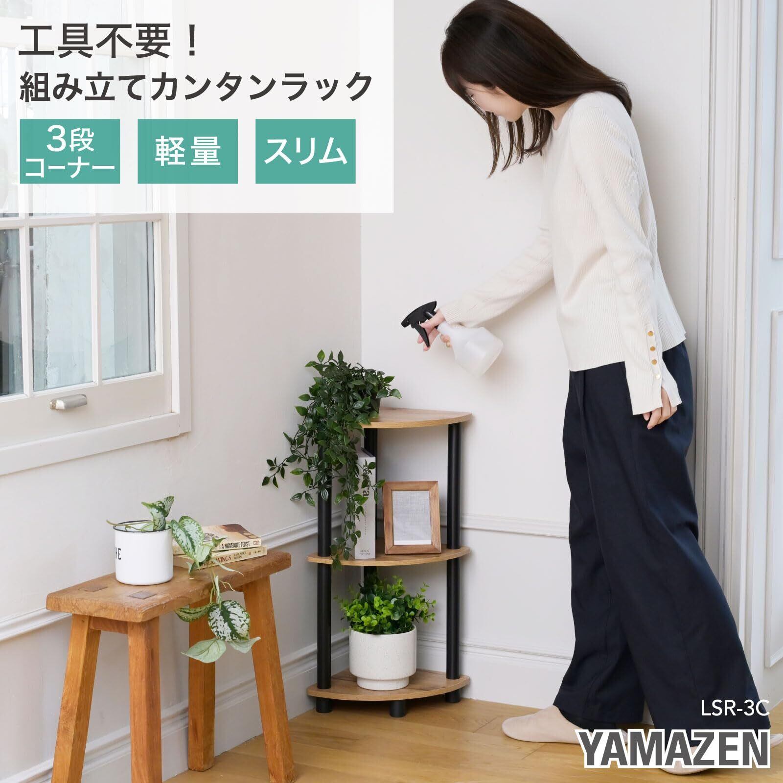 山善(YAMAZEN) ラック 3段 コーナー 棚 組立カンタン 軽量 スリム オープンラック シェルフ 収納棚 一人暮らし 幅27×奥行27×高さ63.5cm 組立品 オーク4/ブラック LSR-3C(OAK4/BK)