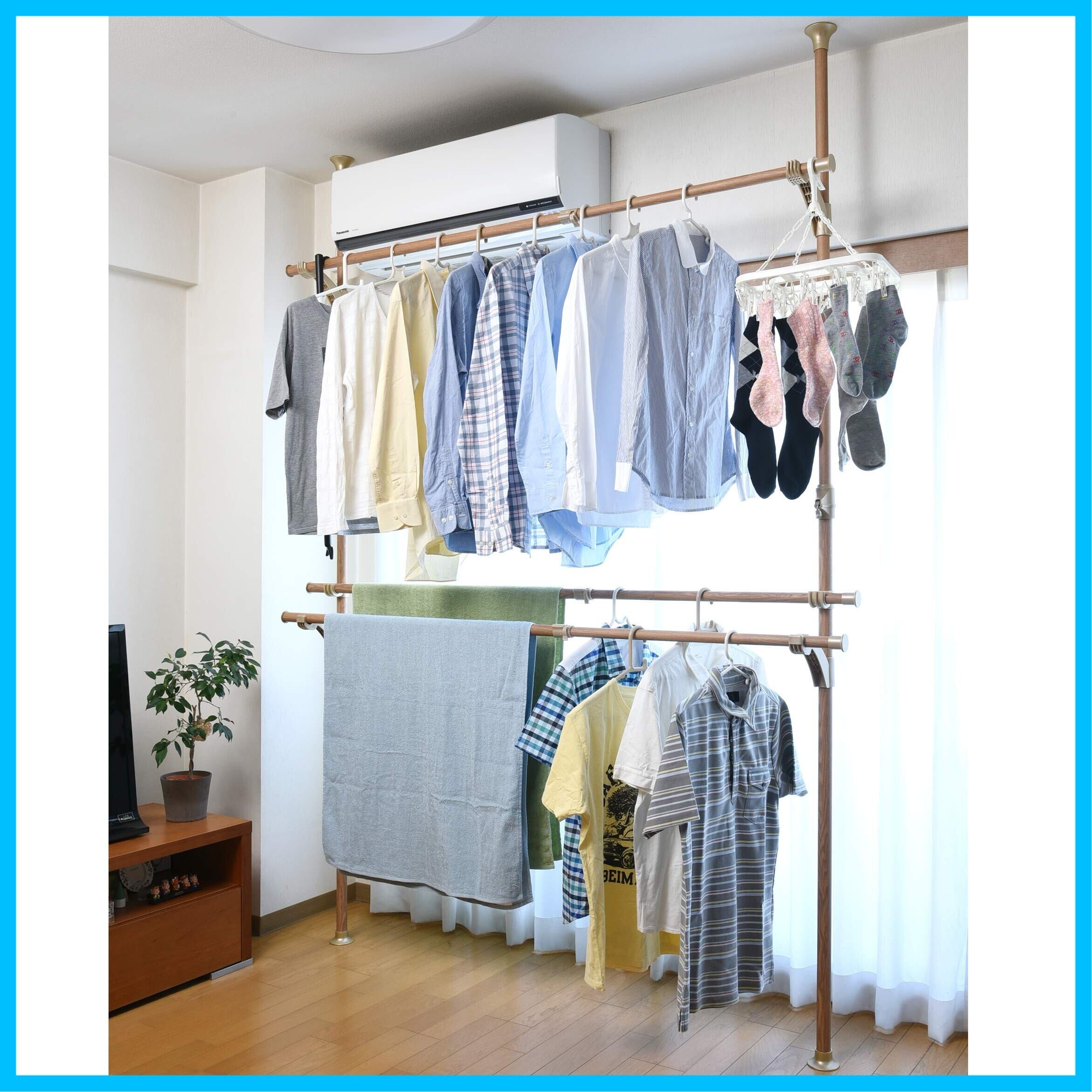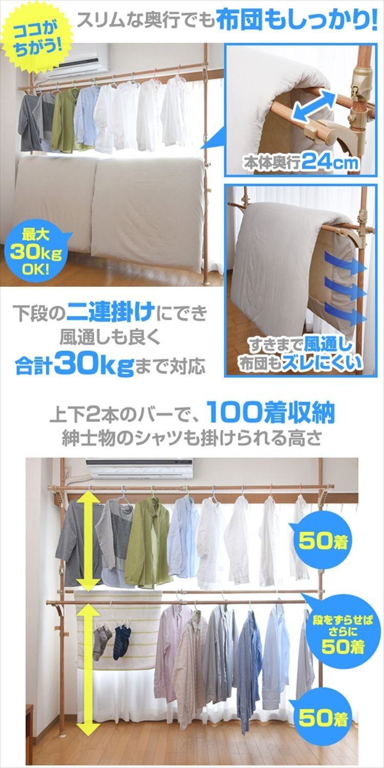 山善(YAMAZEN) 布団も干せる 簡単設置 窓際 突っ張り物干し ハンガーラック ナチュラル(木目調) WJM-3(GNA)