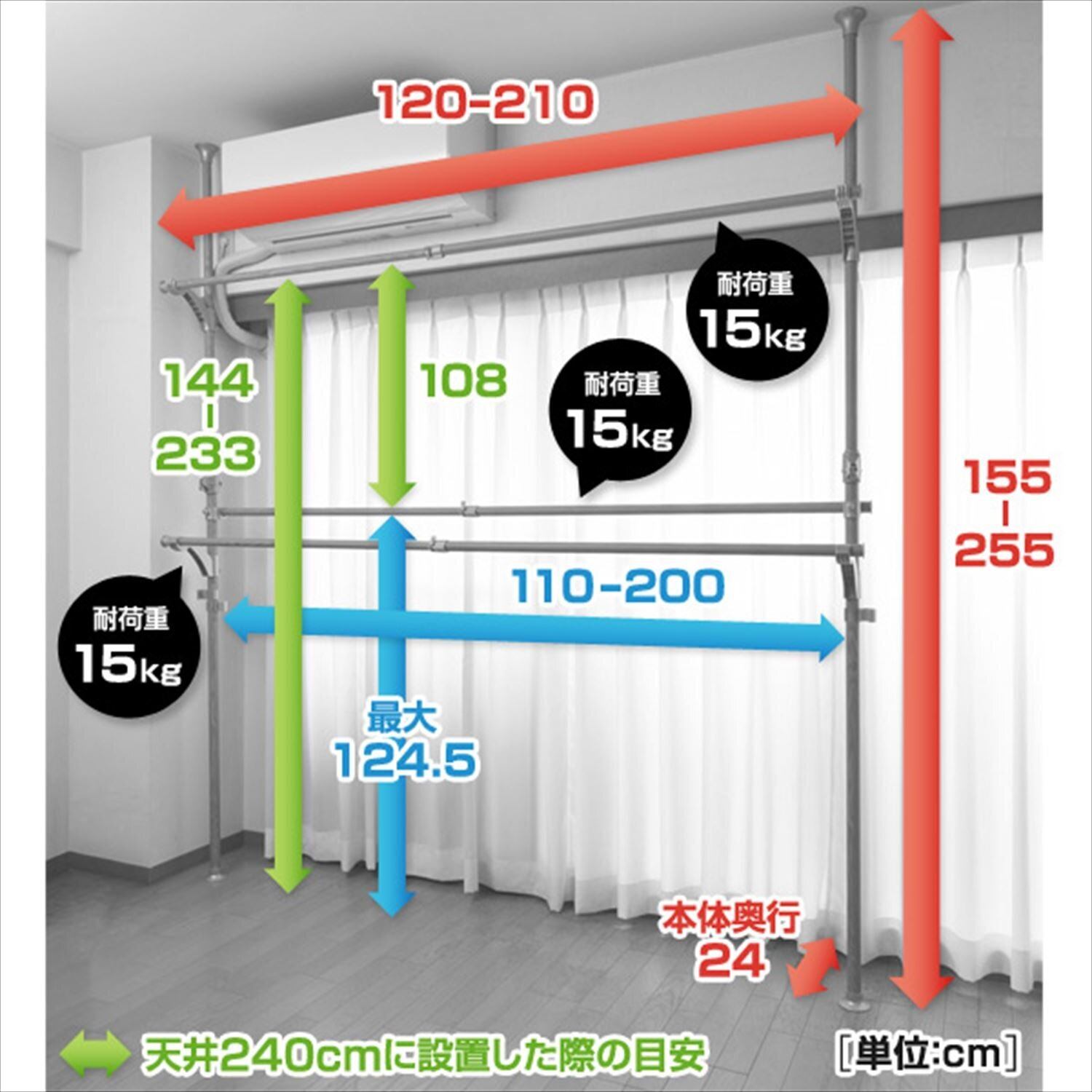 耐荷重:バー1本あたり15kg、全体で45kg