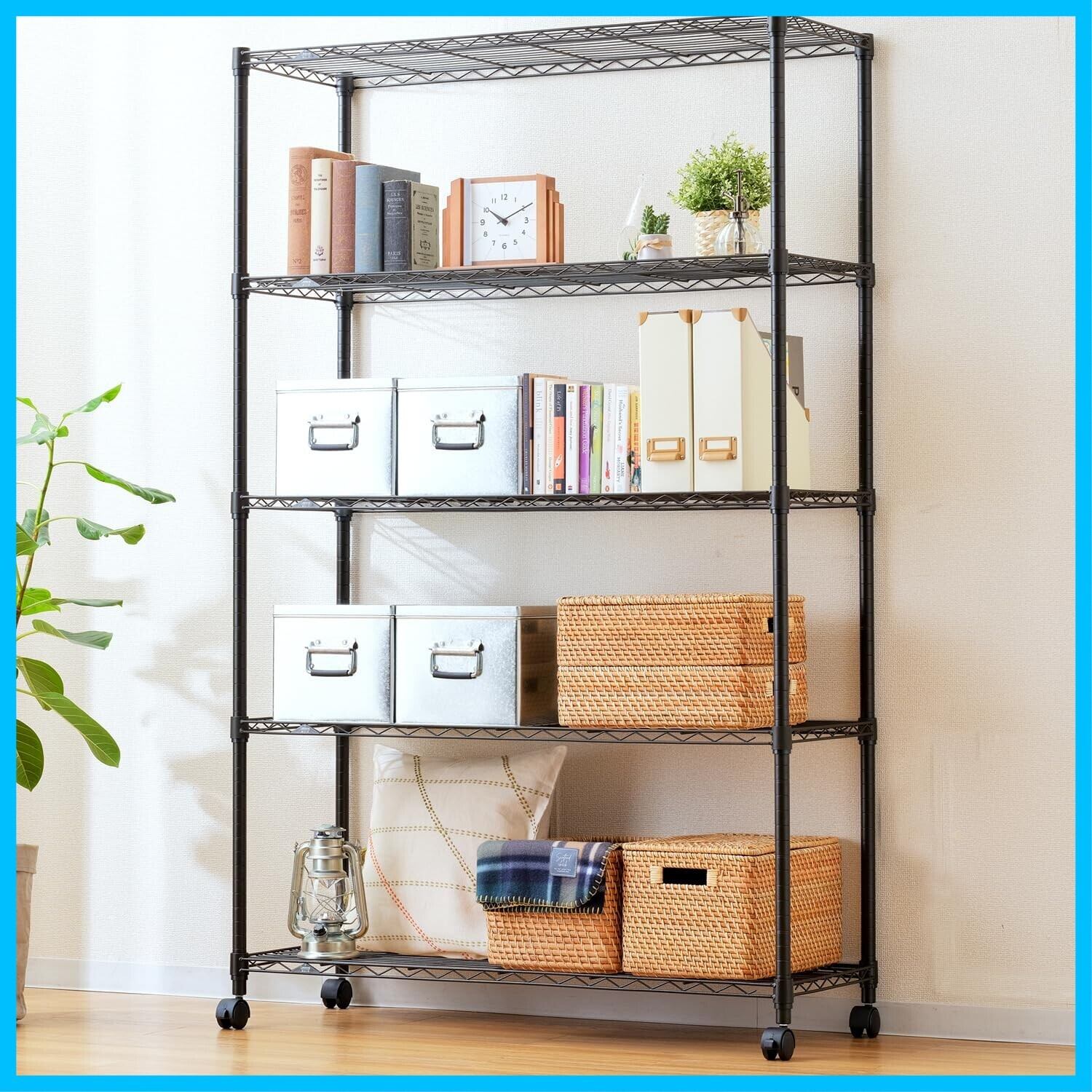 ドウシシャ ルミナス ノワール ラック 5段 幅110 奥行40 キャスター付き スチールラック 黒 ブラック 収納棚 おしゃれ キッチンラック サビに強い 組立簡単 幅111×奥行41×高178.5cm(キャスター込) ポール径25mm 耐荷重80kg NO1118-5