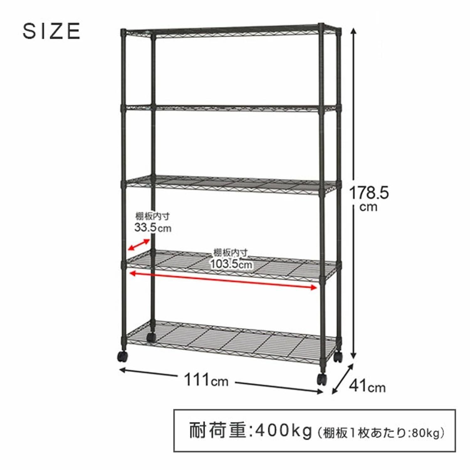 棚板1枚あたり80kgまでの重量に耐えられる。