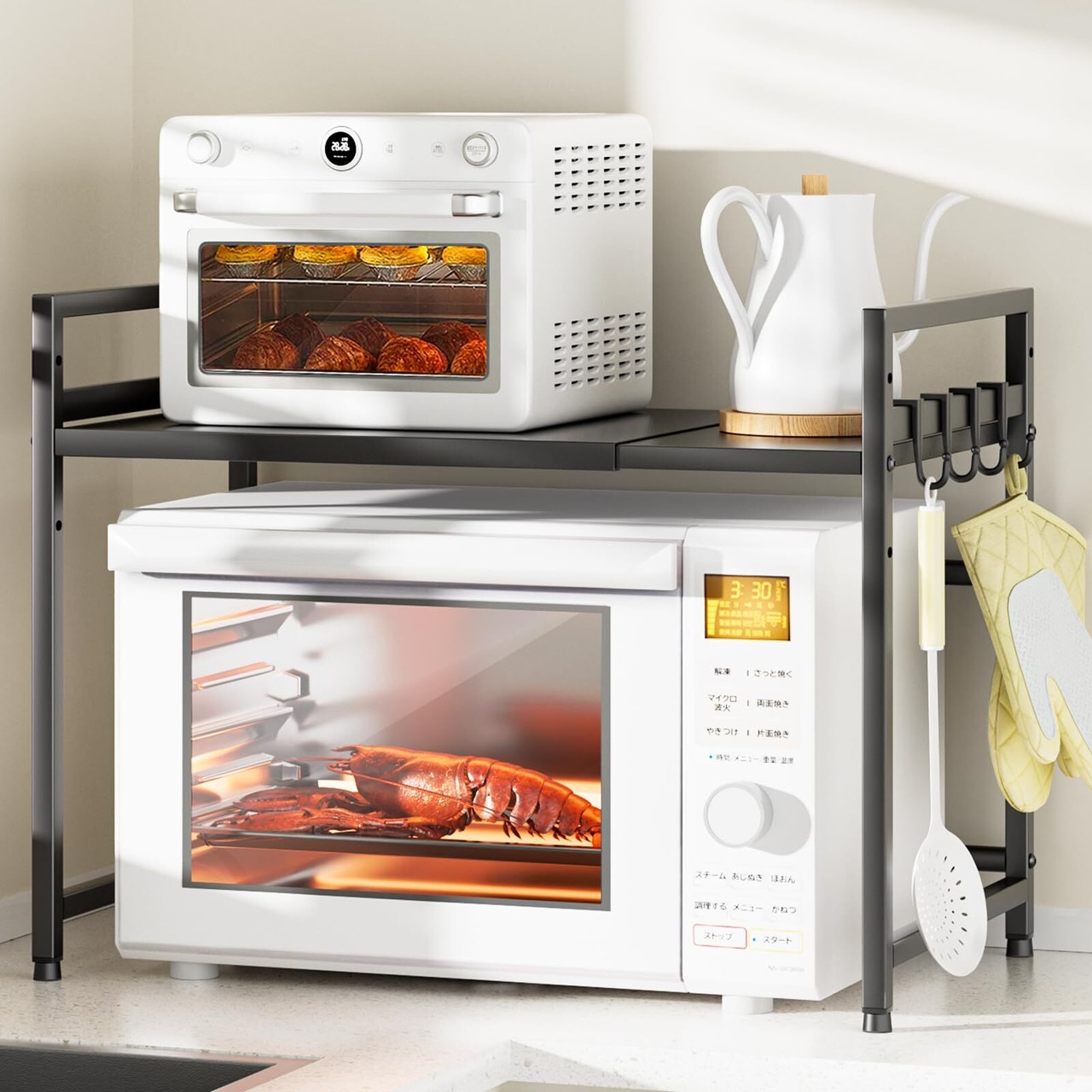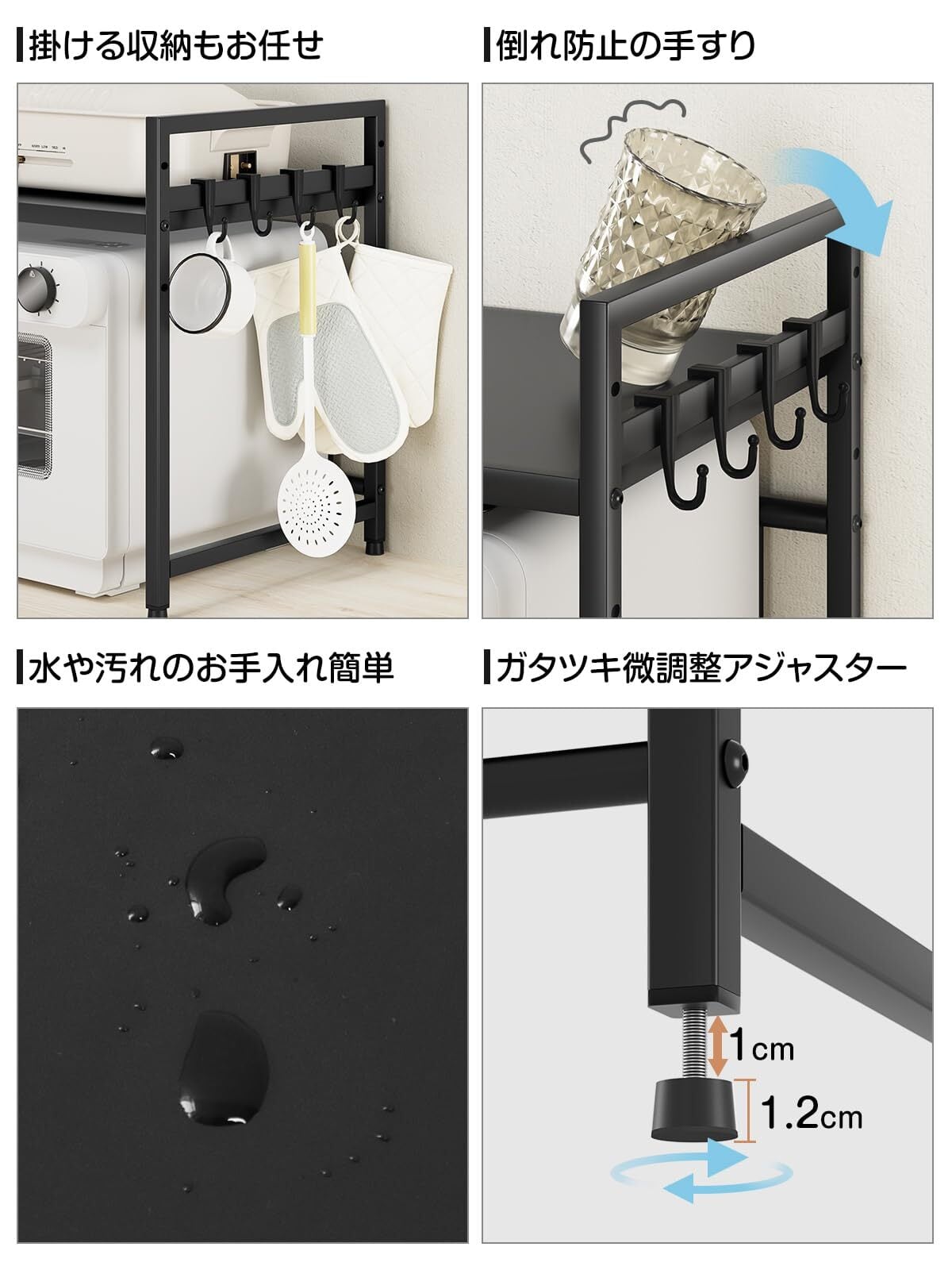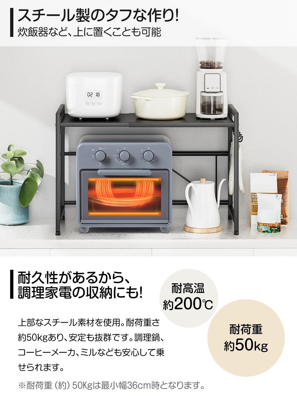 DAIWIN レンジ上ラック トースターラック レンジラック 伸縮式 幅(36~65cm) 棚板高さ調節可 耐荷重50kg シンク上キッチン収納ラック フック4個付き (ブラック)