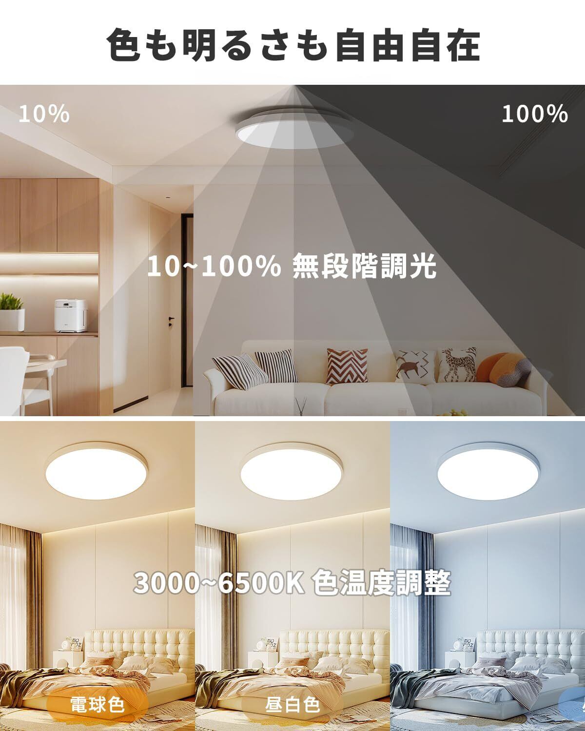 【多段階調光・調色でシーン対応】12段階調光(10%-100%)+7段階色温度(3000K~6500K)。ワンタッチで電球色/昼白色/昼光色を即時切り替え。リビング・寝室・書斎などあらゆるシーンに適応