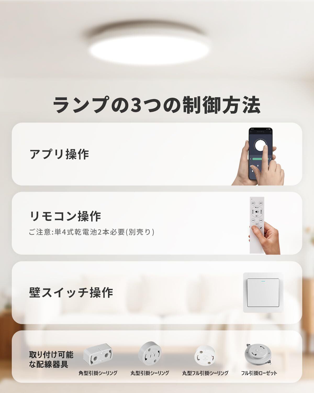 リモコン・スマホ操作:ペアリング手順:壁スイッチOFF→ON後2秒以内に「点灯」ボタンを3~5秒長押し(点滅で完了)ブレーカー操作でも設定可能。2.4GHzリモコン:ホルダー付属(電池別売)。アプリ連携:専用アプリ「LampSmart Pro」でスマホからも操作可能。