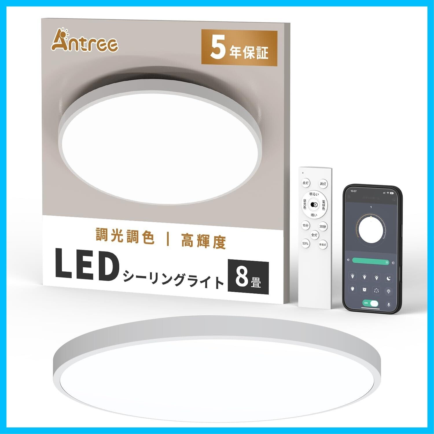 Antree Led シーリングライト 8畳 10畳 38W 高輝度 4600lm 豆電球常夜灯 調光調色 薄型 タイマー・メモリー機能 照明天井 照明器具 Ledライト電気 取付け簡単 低い天井対応 器具一体型 リビング/寝室/書斎/台所/オフィスに適用 リモコン付き スマホAPP操作(5年保証)