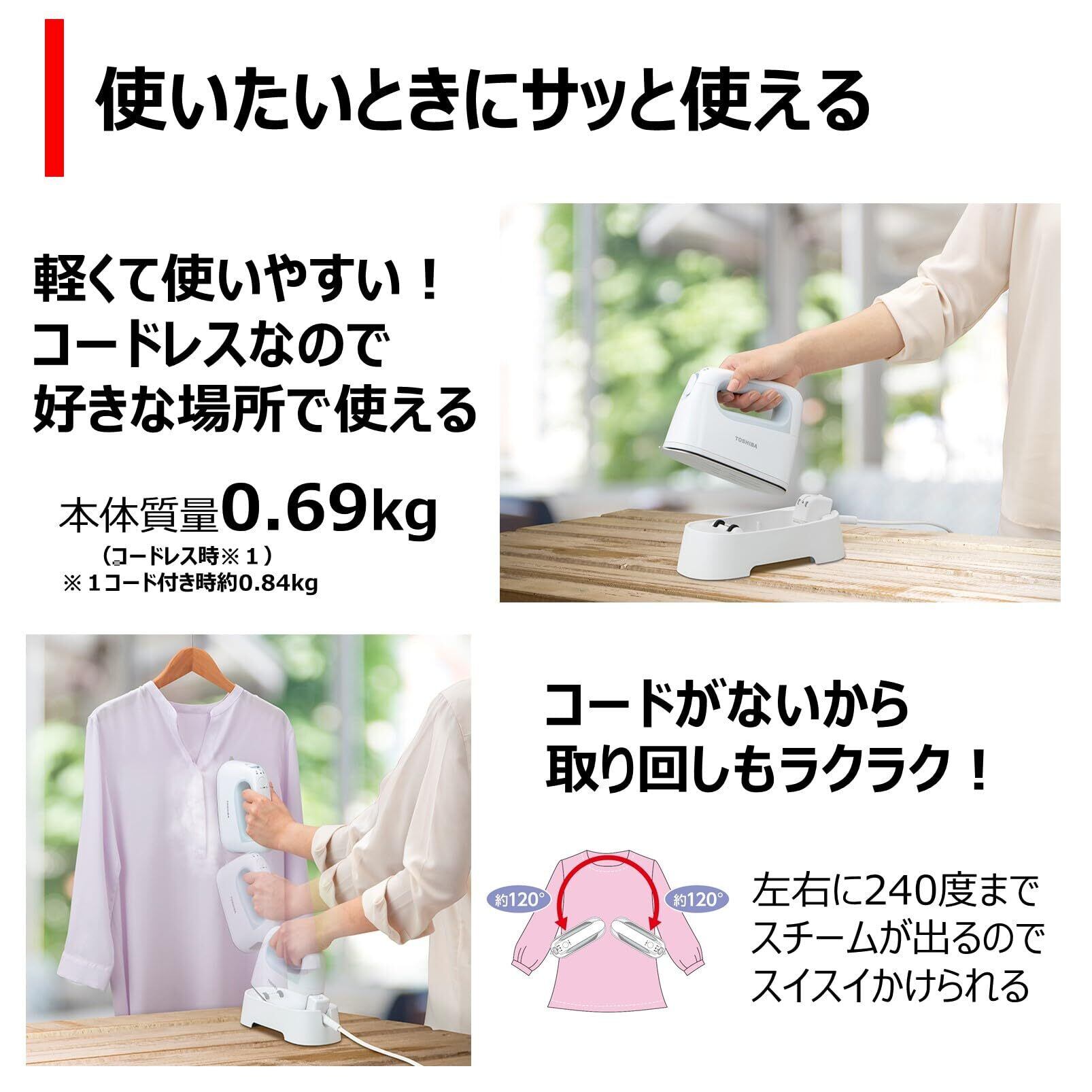 TOSHIBA(東芝) アイロン スチームアイロン コードレス 衣類スチーマー かけたまま 小型 約 0.69kg 最大約 14g/ 分 温度調節 3 段階 2Way TAS-X6-L