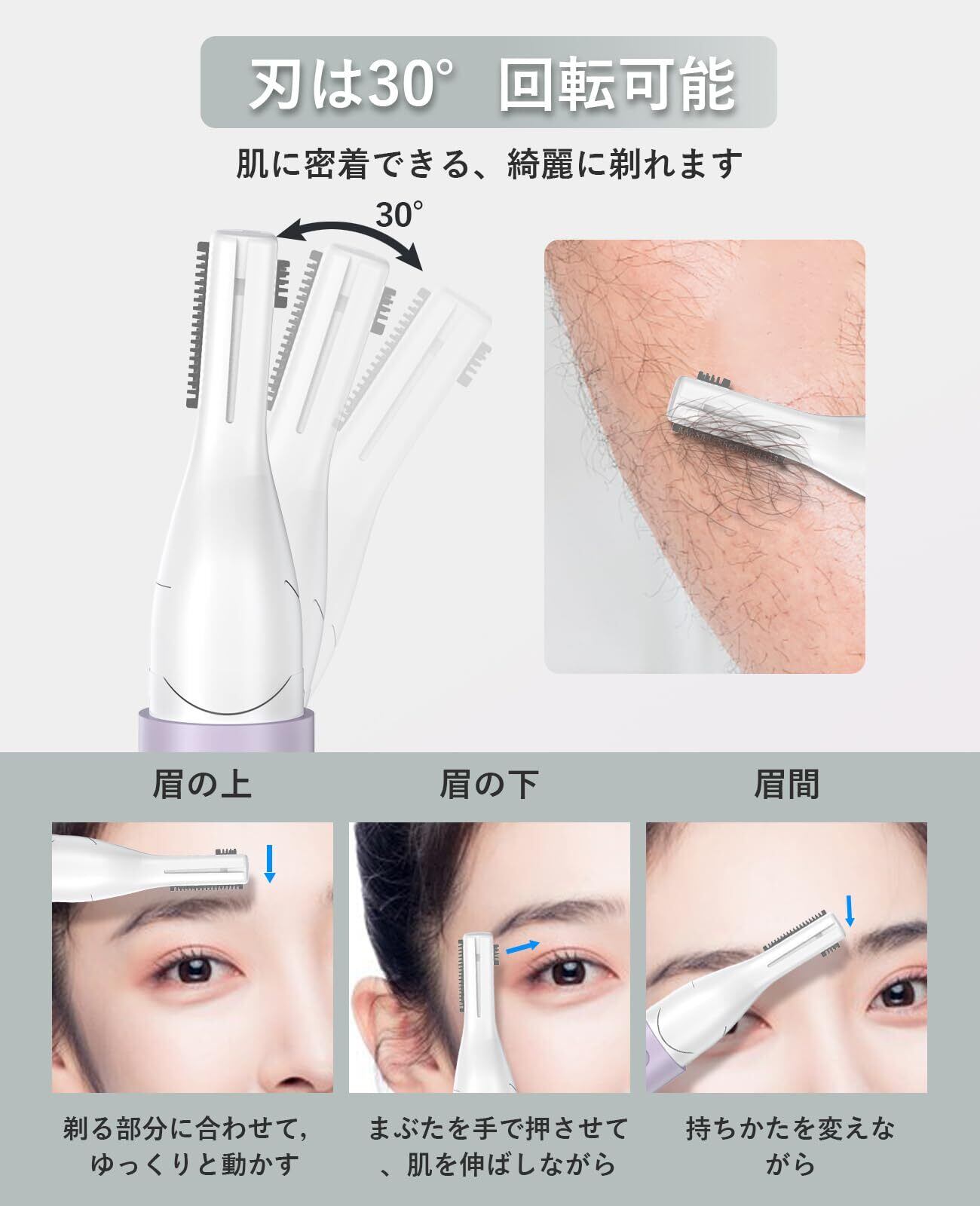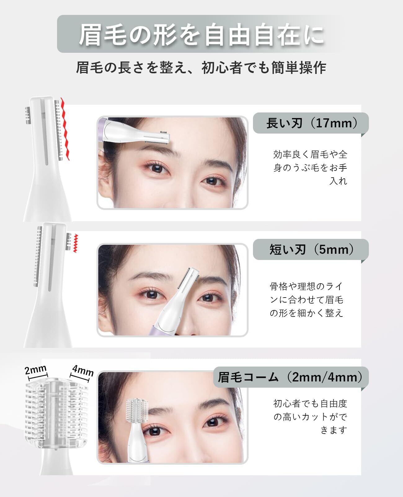 【革新的技術30°回転設計・デュアルサイズ刃】 眉毛シェーバー メンズの最新技術のヘッド部が30°回転する設計のため、肌に密着し、細かい部分もきれいに剃ることができます。 通常眉毛カッターの幅広刃に加え、眉毛を整える際に細かい形状を作るための小型刃を追加しました。 フェイスシェーバー レディース 2mm/4mmのロング/ショートコームが付属しており、簡単に形を整え、長さを調節して理想の眉に仕上げることができ、初心者でも簡単に使うことができます電気シェーバー 女性。
