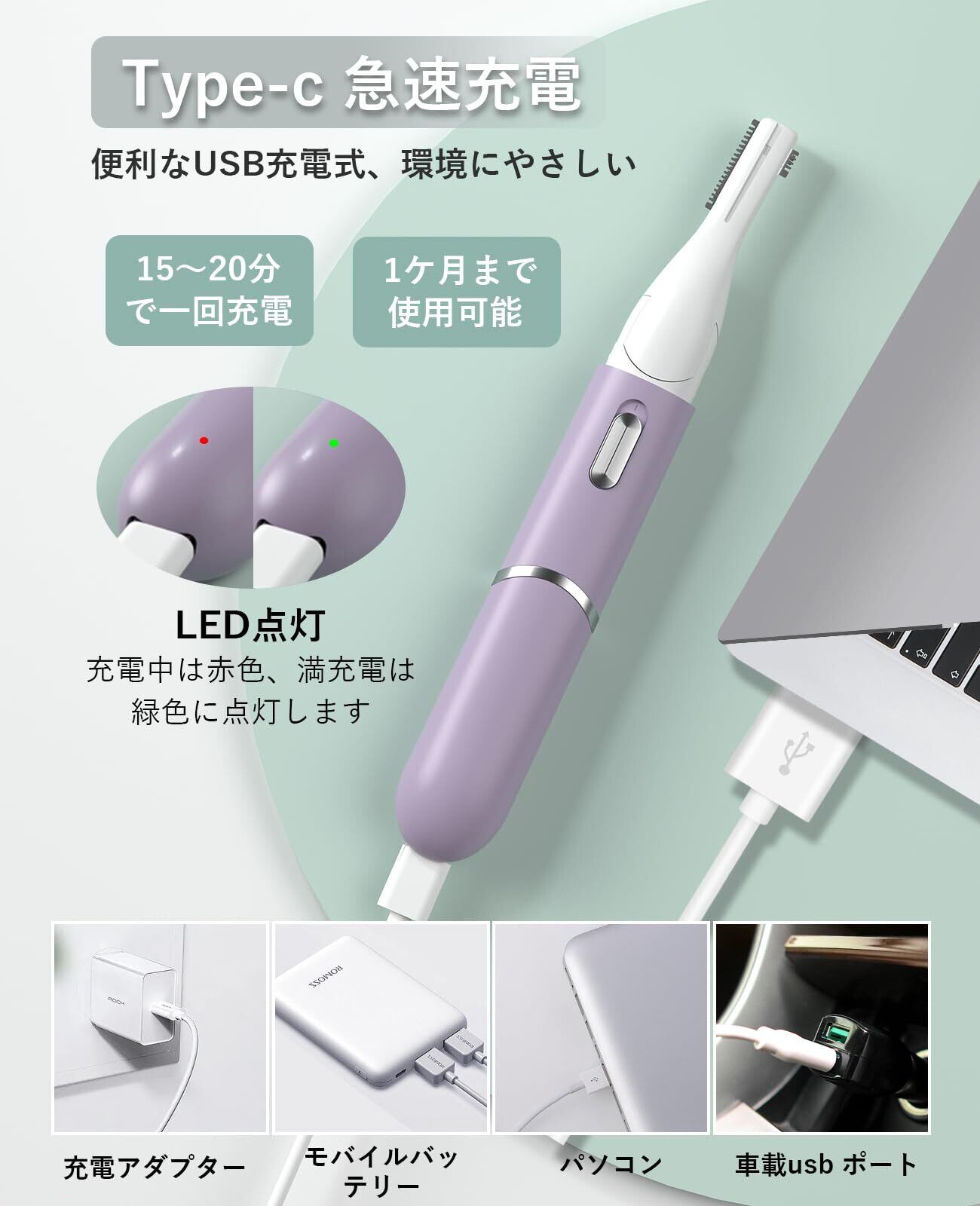 【USB急速充電・持ち運び便利】電動カミソリ電池を内蔵し、USBケーブルで簡単に充電でき、充電時間は15~20分で1~2ヶ月使用できるメンズシェーバーです。耳毛カッター電池交換の手間を省きながら、環境とエネルギーに配慮した高効率なシェービングを実現します。軽量・コンパクトで持ち運びに便利な産毛 シェーバーは、旅行や出張、キャンプ、オフィス、自宅など、様々な場所で使用でき、場所を選びません。眉毛剃りクールなブラックとエレガントなホワイトは、男性にも女性にもおすすめですよ。