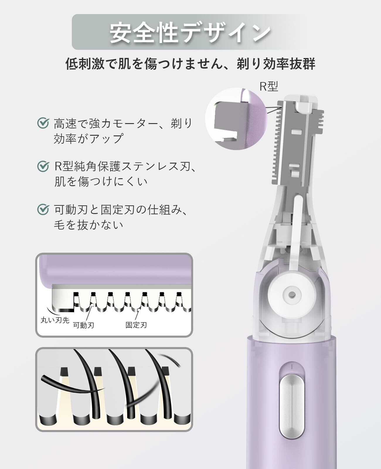 【肌に安全・剃り効率が高い】電動シェーバー 女性ヘッドは最新のR型鈍角設計で、肌に刺激がなく、やさしい。産毛剃り高速で強力な内蔵モーターと固定および可動ブレードの組み合わせにより、直接肌に触れることなく、引っ張ることなく効率的に毛を剃ることができ、最小の領域でも高速できれいに剃ることができます。傷や赤みを防ぎ、刺激を与えず、敏感肌の人は安全に使うことができますの顔剃り レディース。