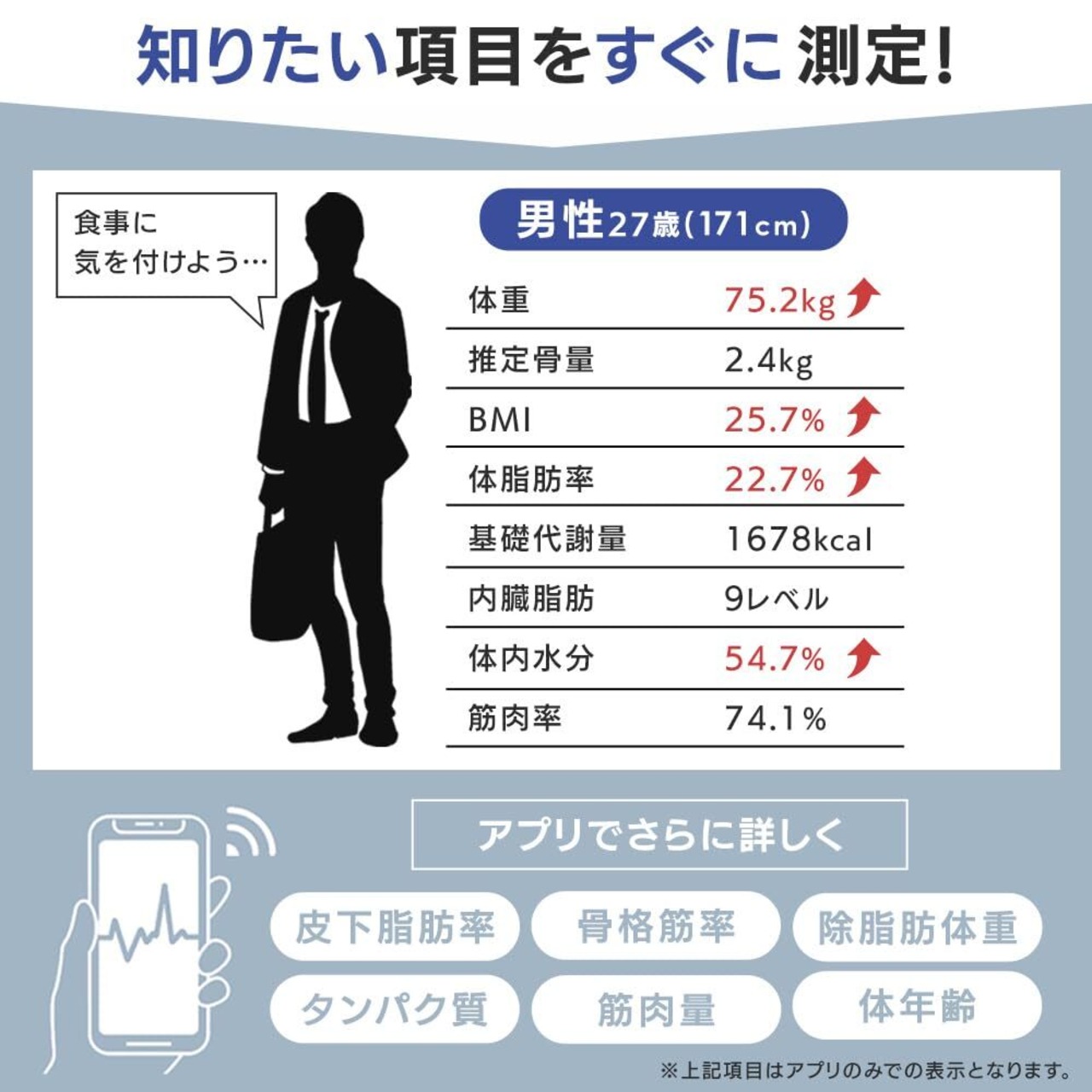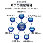 測定項目:体重、体脂肪率、体水分率、筋肉率、推定骨量、内臓脂肪レベル、基礎代謝、BMI※アプリのみでの表示:皮下脂肪率、除脂肪体重、筋肉量、骨格筋率、タンパク質、体年齢