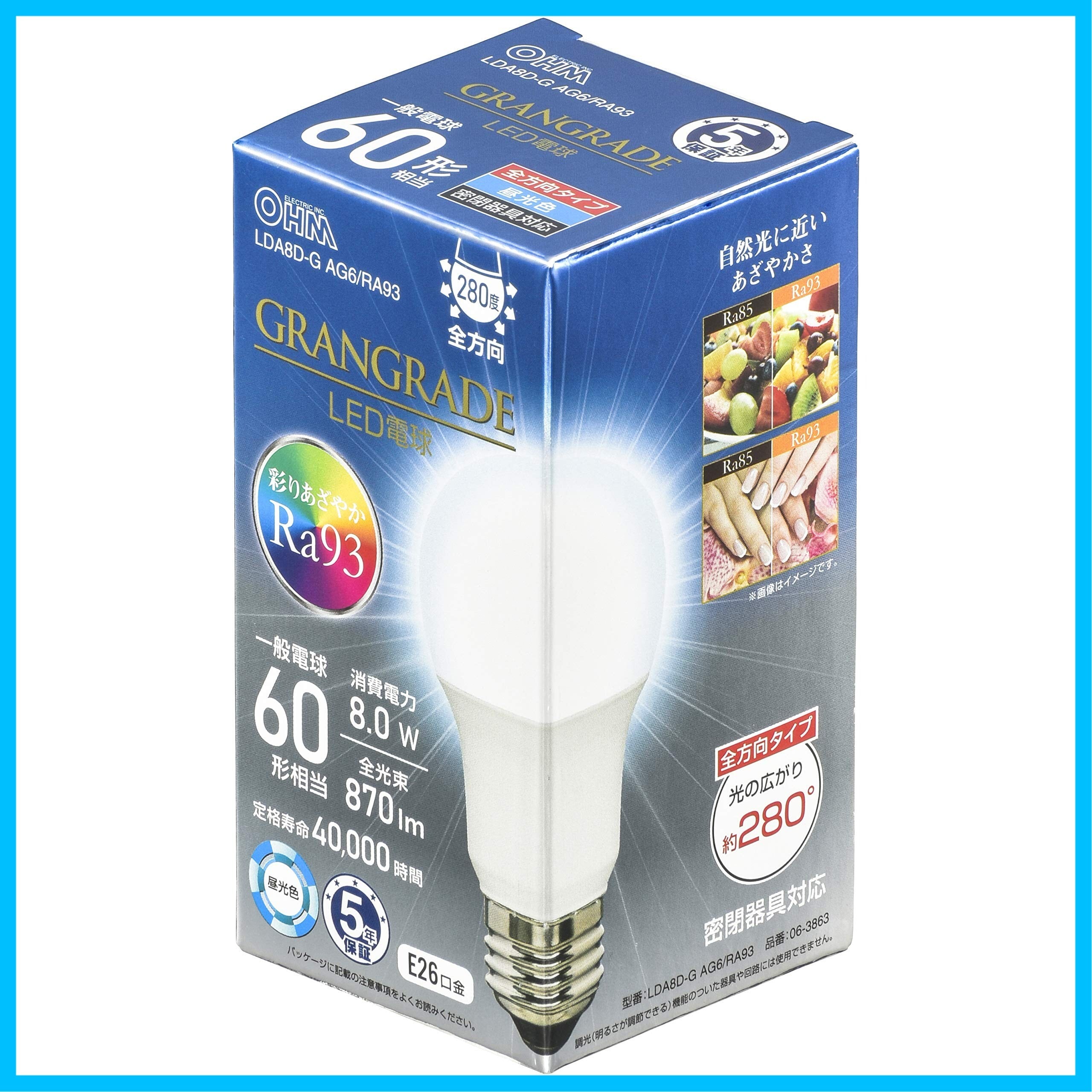 オーム電機 LED電球 E26 60形相当 昼光色 LDA8D-G AG6/RA93 06-3863 OHM