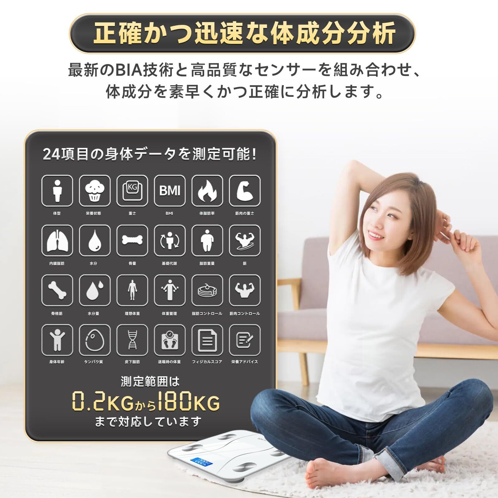 【高精度のBIA測定技術と優れたセンサー】BIA技術と高品質なセンサーを使用し、体成分を迅速かつ正確に分析します。電源を接続するだけで、24項目の身体数値を測定することができます。測定範囲は0.2kgから180kgで、測定誤差は100g以下であることが保証されています。すべての測定値と結果は、スマートフォンアプリ「scale up」と接続されており、正確な身体管理が行います。