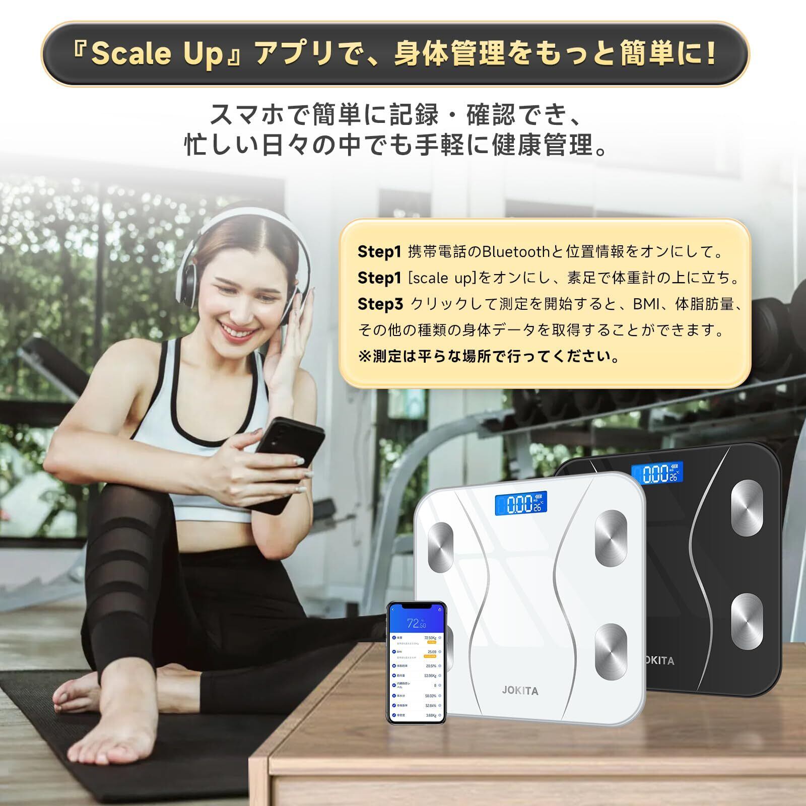 【使用方法】携帯電話のBluetoothと位置情報をオンにして、[scale up]をオンにし、素足で体重計の上に立ち、クリックして測定を開始すると、BMI、体脂肪量、その他の種類の身体データを取得することができます。 *測定は平らな場所で行ってください。