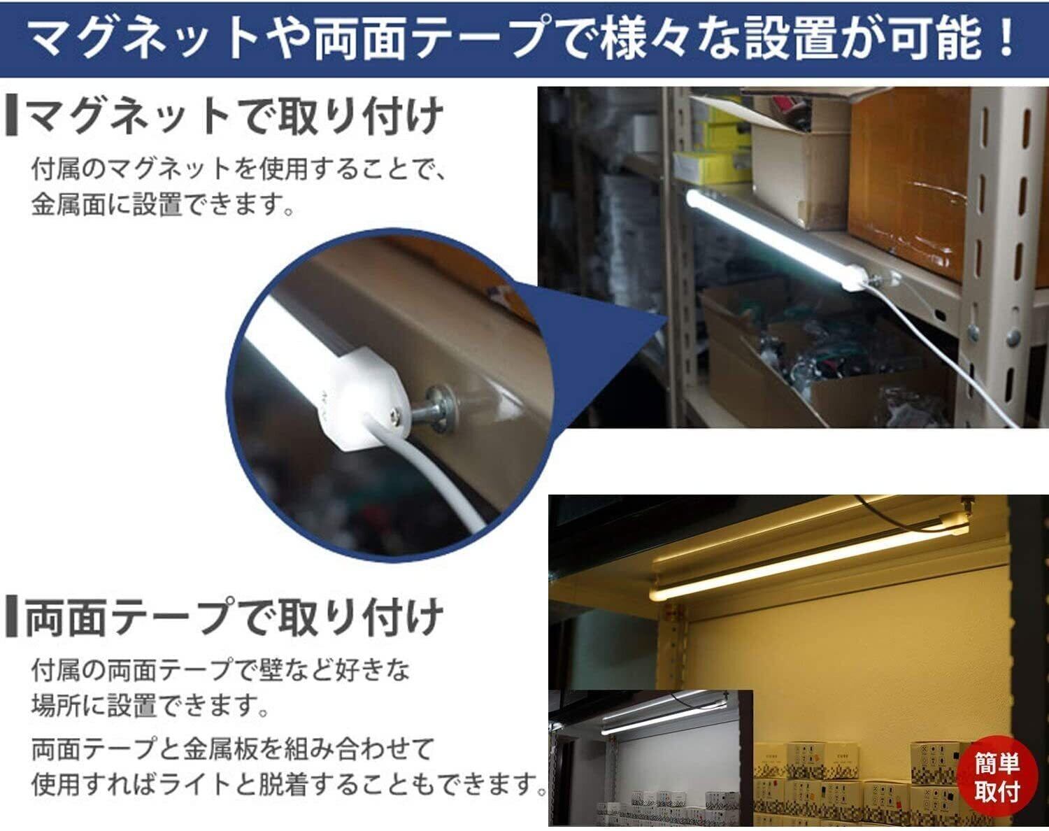 【工事不要・取り付け簡単】LEDライトでは両面テープが付属し、電気工事不要で壁や棚など色んな場所に貼り付けるだけですぐに使えます。裏面に磁石もあり、鉄面にしっかりとくっつくことができます。