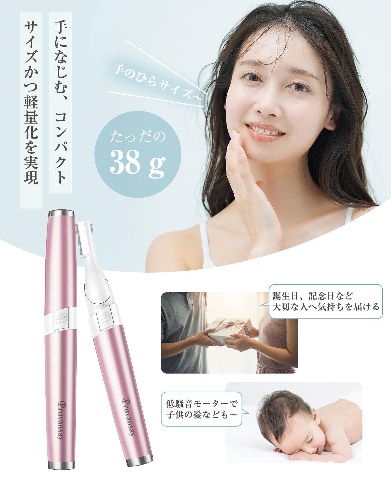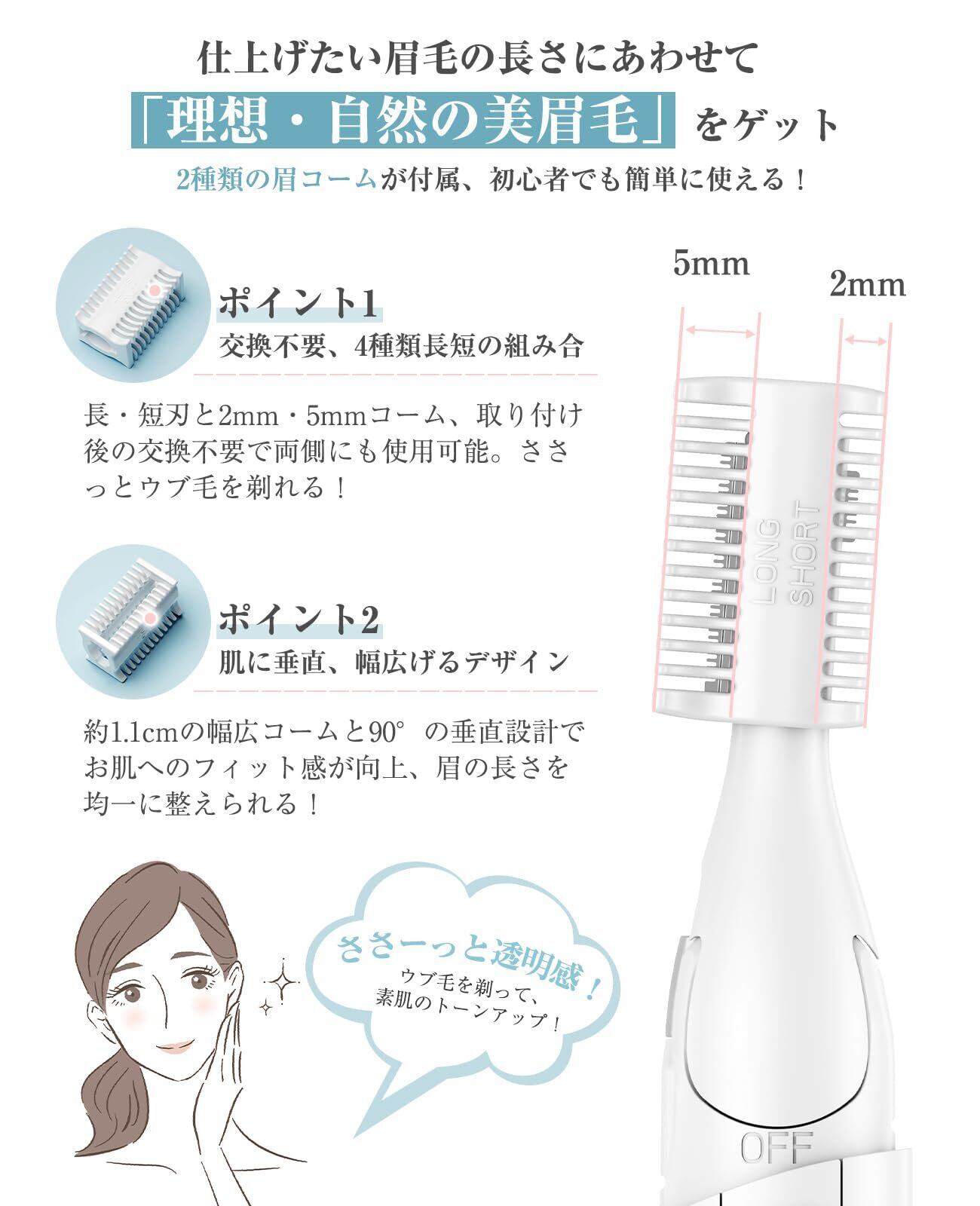 【丸い刃先&お肌に優しい&携帯便利】眉毛シェーバーの刃先はで最新のR型鈍角保護精鋼ステンレス肌にやさしい丸い刃で、カミソリのように肌を傷つける心配もありません。初心者・はじめて顔剃りをする人などの肌が弱い方にも安心してご使用できます。サイズも一般的なレディース用フェイスシェーバーより小型・コンパクトなので、出張や旅行などに持ち運びやすいです。メイク道具と一緒に持ち歩けるので、外出先でもすぐに眉・顔のお手入れができます。