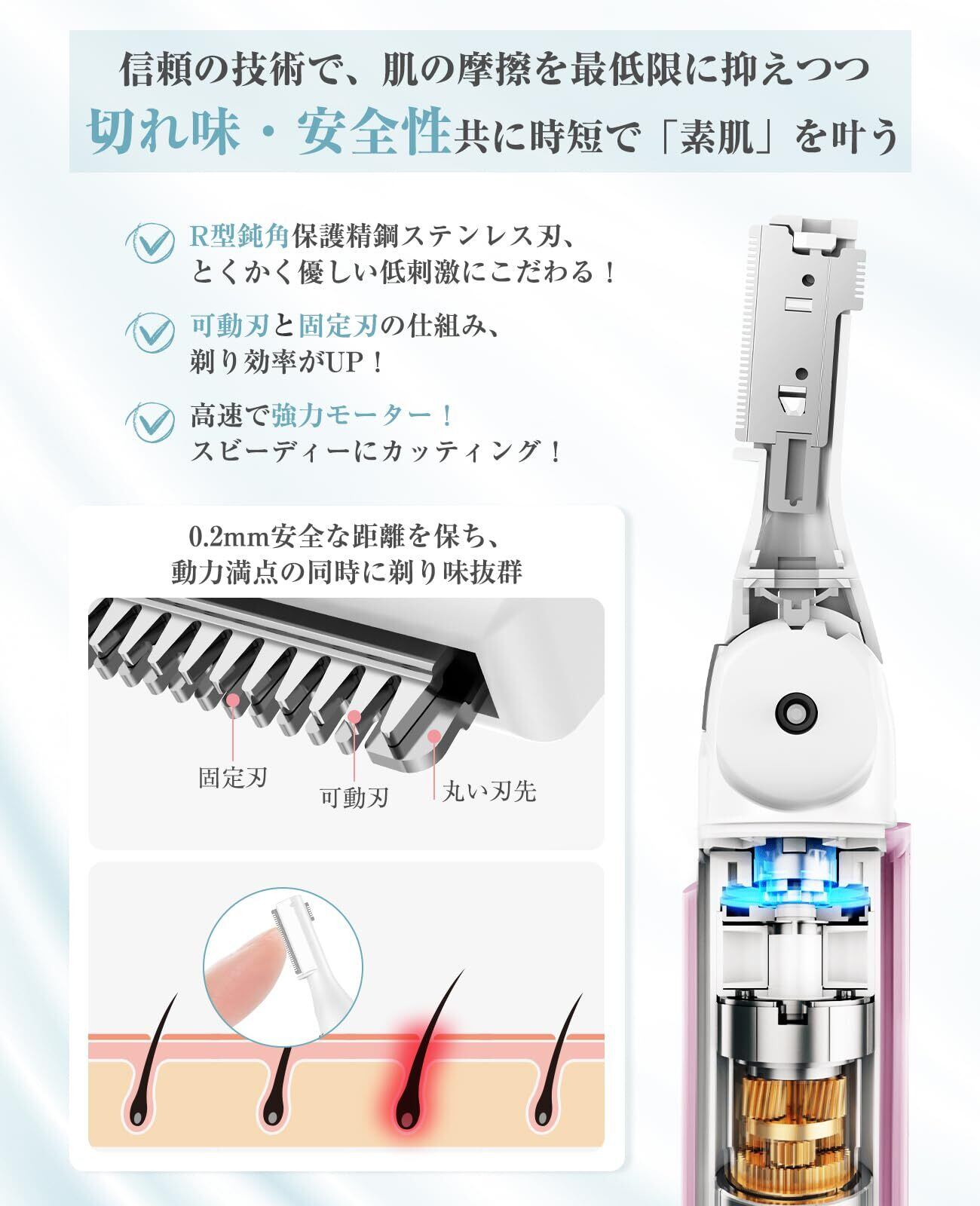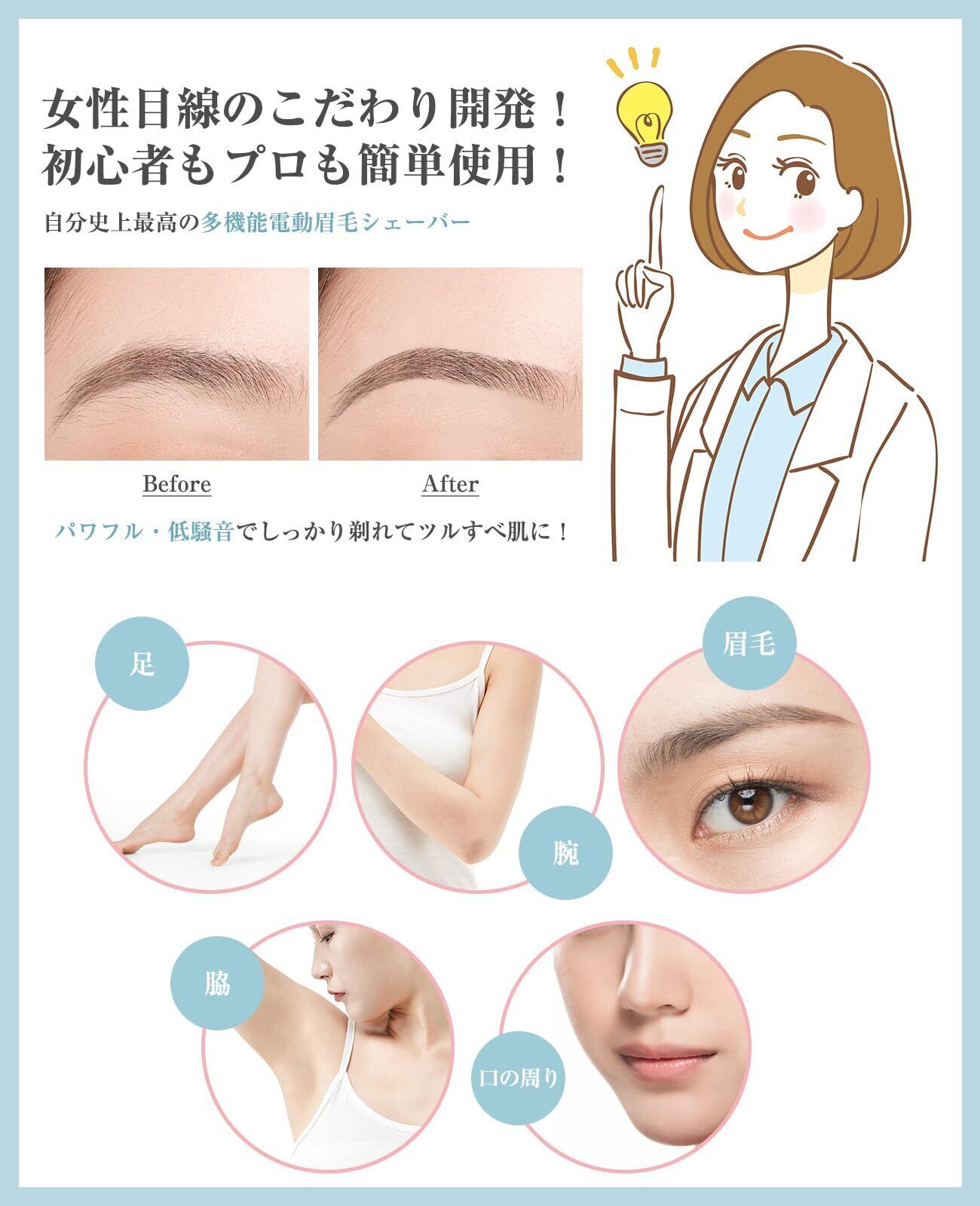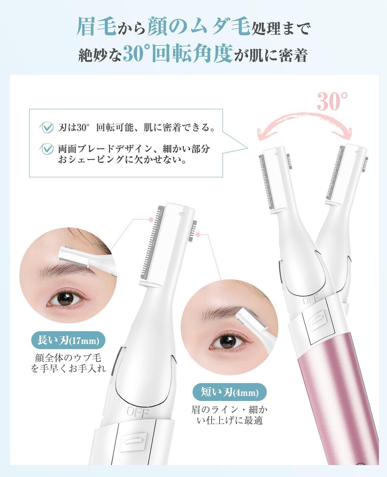 【革新的な技術30°回転設計&両面プレード】数百万のお客様の意見に基づいて女性向けに設計された眉毛シェーバーなので、どんな毛質でも安心してカットできます。この新型多機能な電動眉毛シェーバーを設計します。最新技術ヘッド部分が30°回転する構造なので、肌に密着できます。5mm小さい刃である、細かい部分もキレイに剃ることができます。両面ブレード固定刃と可動刃で毛を挟んで切る眉毛微調整もできる仕組みです。剃れ味が拔群で剃れにくい悩みが無し。
