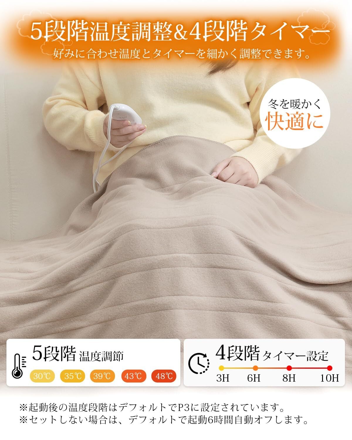 【5段階温度調整・切り忘れ防止タイマー付き】電気毛布はボタンを押すだけの簡単操作で、温度とタイマーの時間を細かく設定することができる。コントローラーを備え、ボタンを押すだけで温度を(30、35、39、43、48℃)5段階の範囲で調節できます。また、この電気毛布敷きはタイマー機能が搭載され、3、6、8、10時間をご自由に選択できます。外出の時、電源を消したかの不安は必要ない。