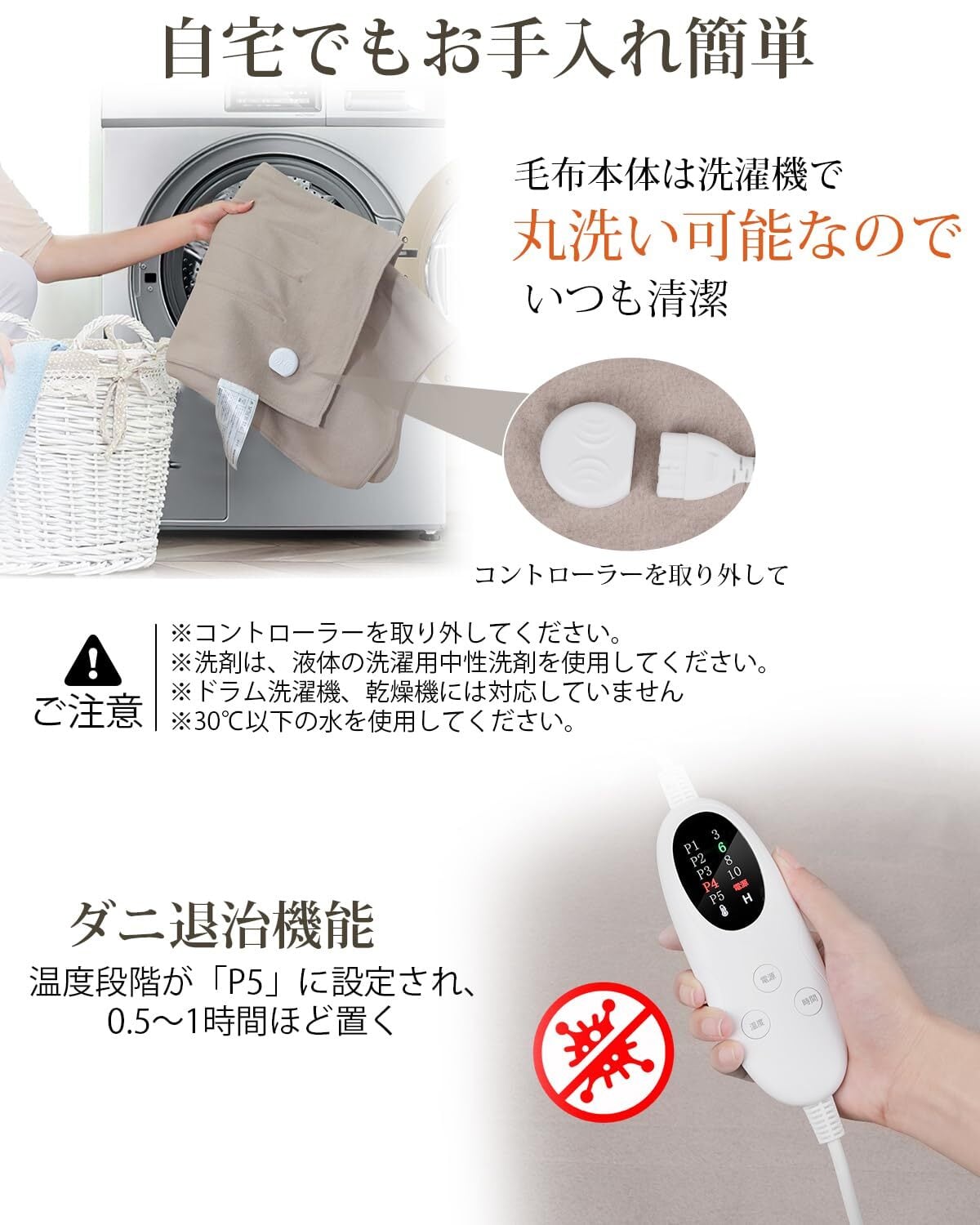 【洗濯機で丸洗いOK&ダニ退治】自宅で洗濯が簡単、コントローラーを取り外し、電気毛布を洗濯ネットに入れて、洗濯機で丸洗い可能。温度段階が「P5」に設定され、1~2時間ほど置いて、ダニを消滅でき、抗菌·除臭を実現します。しかも洗濯機で洗濯できるので、いつでも清潔にお使いいただけます。