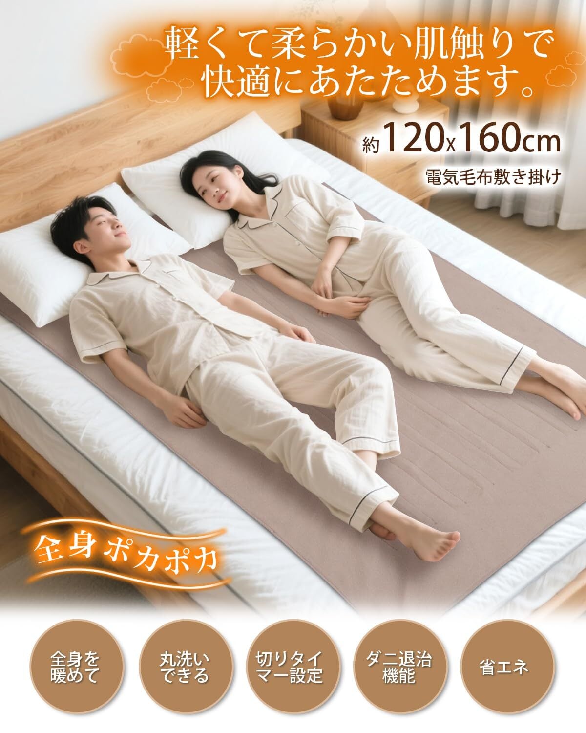 特徴 160×120cm ダブルサイズ, 切り忘れ防止タイマー付き&5段温度調整, 洗濯機で洗える, 省エネ, 表・裏面は起毛加工・やわらかい肌触り