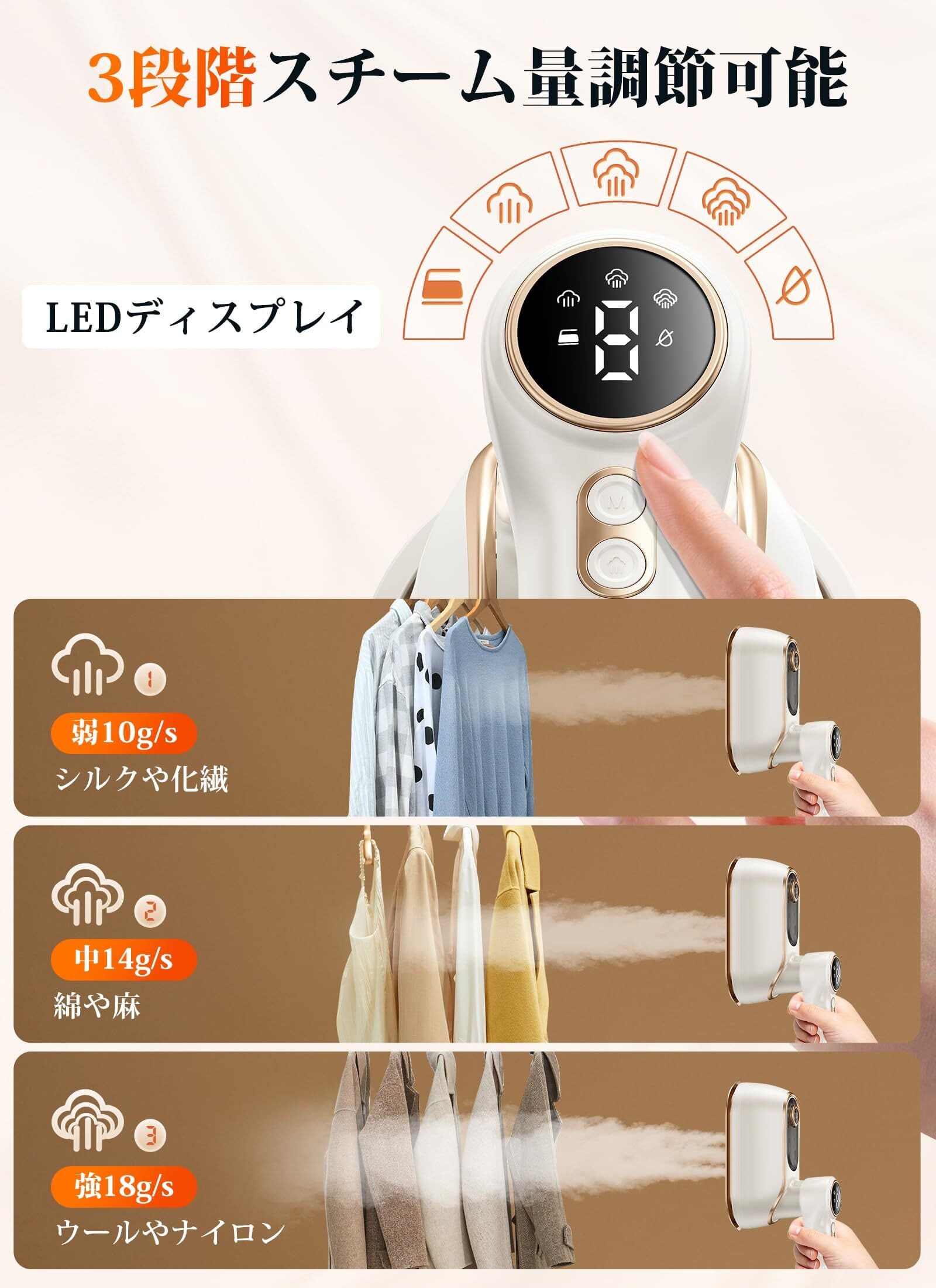 【3段階スチーム・多様生地対応】スチームアイロンは3段階スチーム量調節を搭載し、衣類のシワの状態や生地に合わせて3段階スチーム量が選べます。枕や布団、ソファー、カーテン、おもちゃ、各生地な衣類(綿・麻・絹・化学繊維など)や日常的に肌に触れる様々な布製品に嬉しい効果があります。さらに、NTC低水検知機能により、水量が不足すると欠水提示ランプが点灯します。