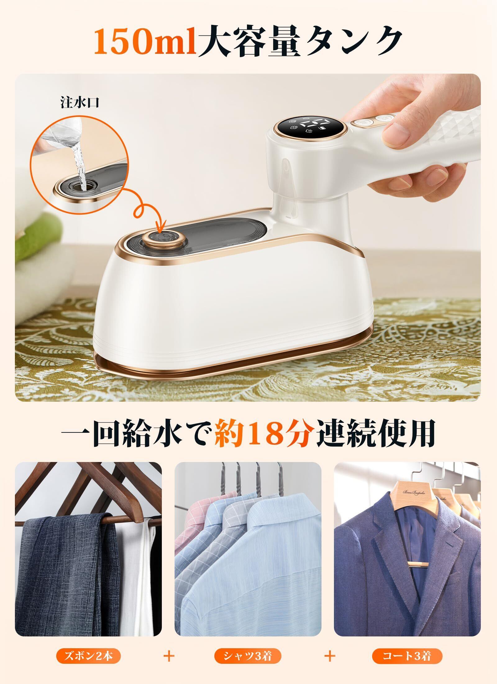 【大容量水タンク・便利デザイン】150mlの大容量タンクを搭載しており、頻繁な水補充の手間から解放され、一回の給水で約18分の連続使用を可能です。360°どこまで傾けても安定した連続スチーム、水漏れの心配なく簡単にしわを取ります。両方の先端が細くデザインで、服の襟や折り目をしっかりと押しつけることができ、ボタン周りのシワなど細かい箇所にアイロンがけするときに便利です。
