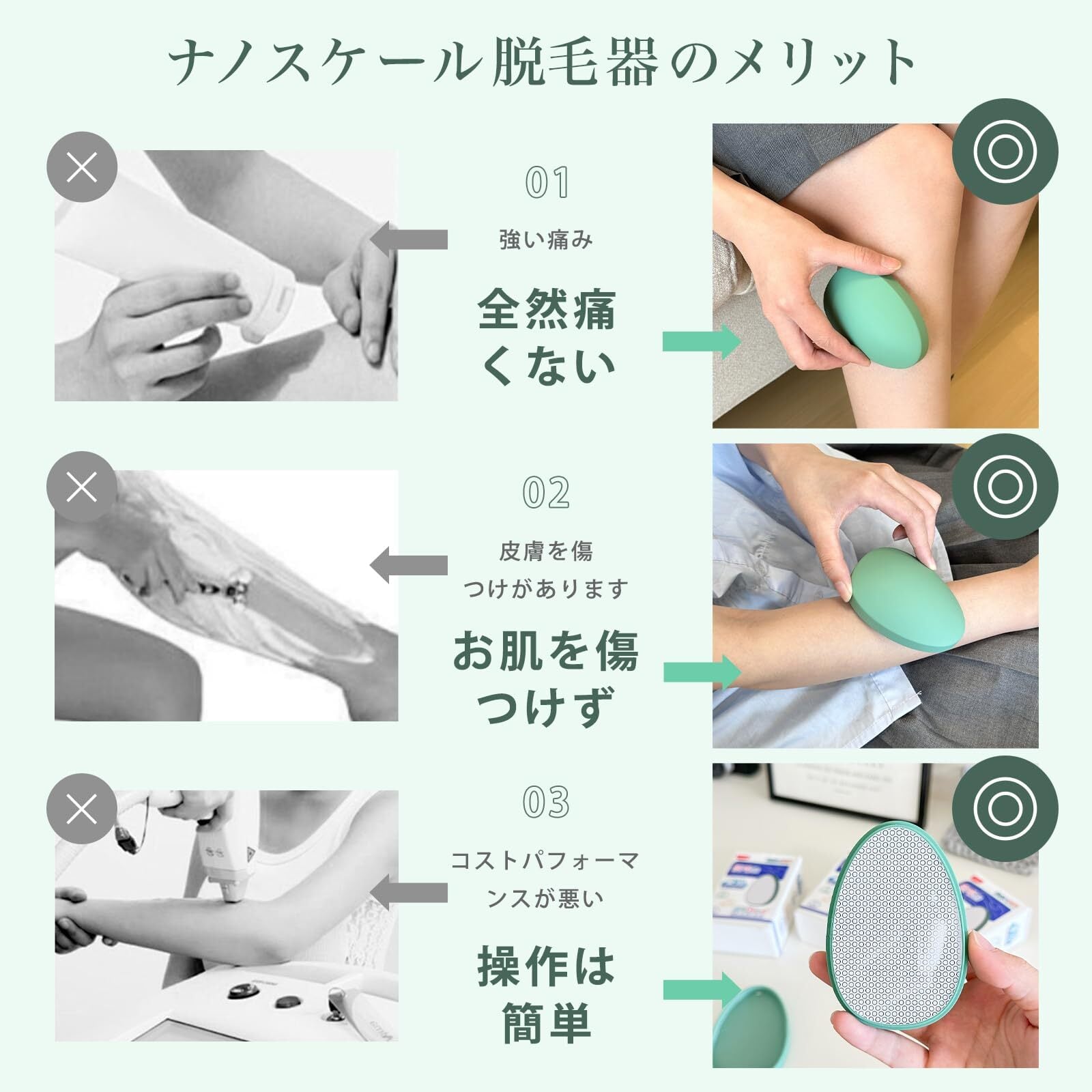 【革新登場・物理無痛脱毛器】最新の脱毛器は、アップグレードされたナノテクノロジーを搭載。安全性に優れ、化学物質を一切含まないため、肌への刺激を大幅に抑えます。。従来のカミソリと比べ、この無痛脱毛器はより優しい方法で肌の毛を除去。肌を傷つけるリスクがほとんどなく、より滑らかで快適な脱毛体験を実現し、肌への負担を最小限に抑えます。
