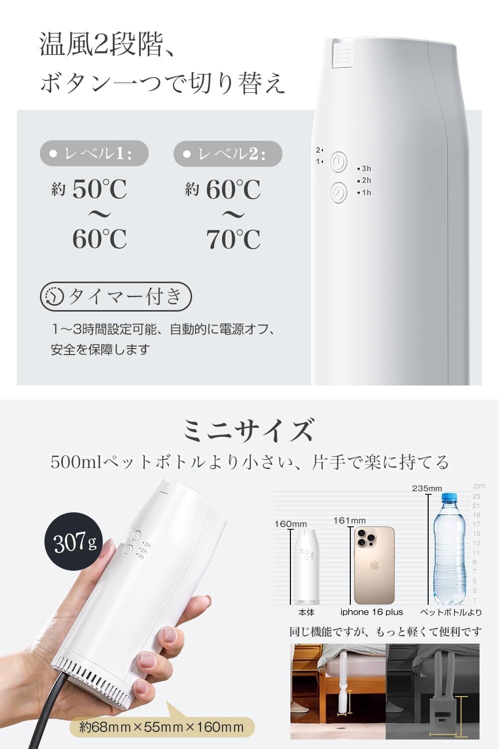 【温度、タイマー設定・四季適用】レベル1には温度が中温風(50~60℃)、レベル2には温度が高温風(60~70℃)、2階段調節できます。タイマー機能も付いており、1-2-3h時間の3段階から選べます。冬に布団を乾燥することに限らず、オールシーズンで役に立つところがあります。例えば、春の花粉対策、夏の汗消臭、秋の衣類乾燥、冬の布団温めなど、季節ごとに大活躍です。